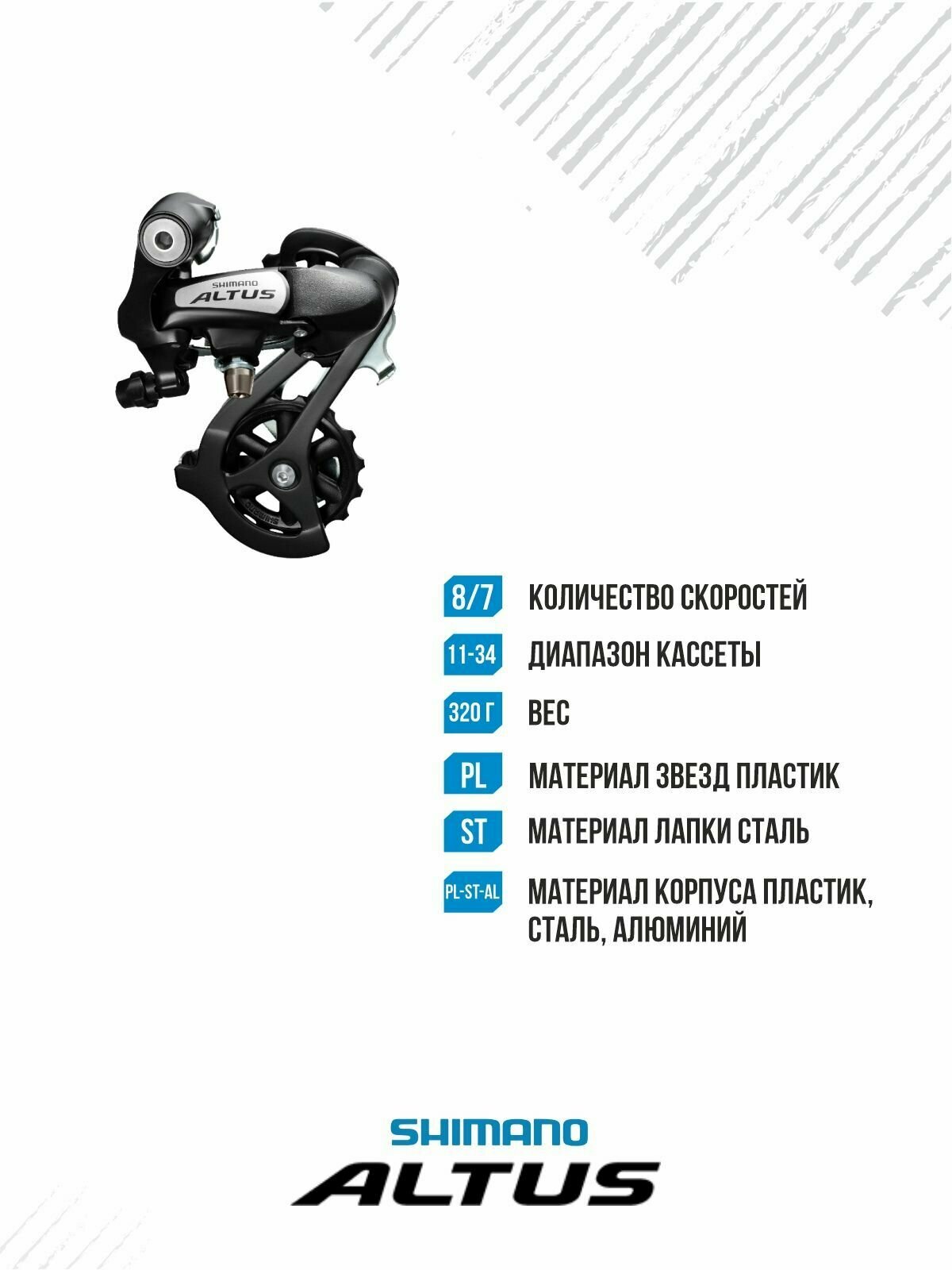 | Дополнительная информация | крепление на петух; максимальное количество зубьев: 34; подвод троса: универсальный; назначение: горный (MTB); уровень: спортивный; трос переключения в комплекте: нет; вес: 326 г; материал: алюминий, пластик; тип хомута: универсальный; количество звезд системы: 6.7 |