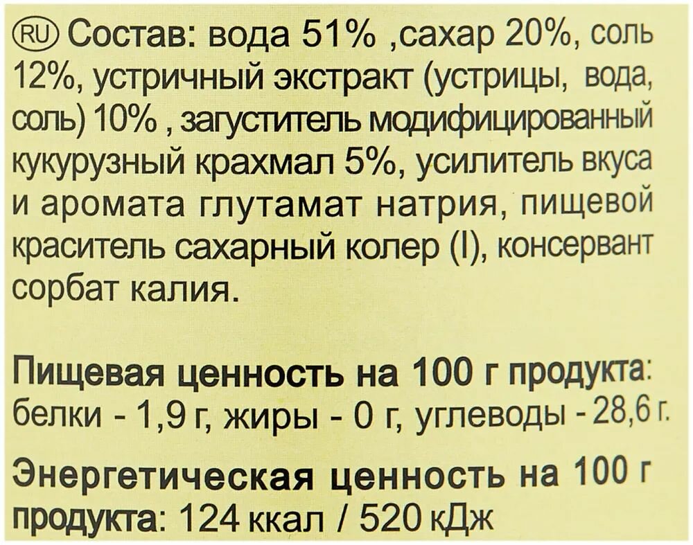 | Состав | вода 51% ,сахар 20%, соль 12%, устричный экстракт (устрицы, вода, соль) 10% , загуститель модифицированный кукурузный крахмал 5%, усилитель вкуса и аромата глутамат натрия, пищевой краситель сахарный колер (I), консервант сорбат калия |