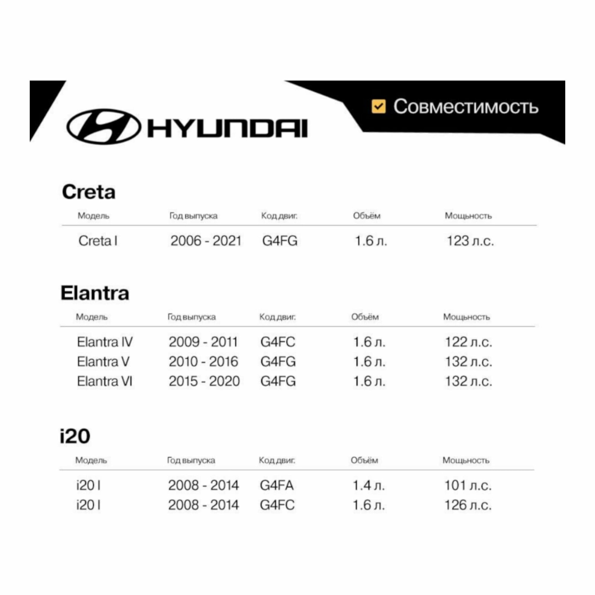 | Модель автомобиля | Hyundai Creta / Hyundai Elantra / Hyundai Solaris / Kia Carens / Kia Ceed / Kia Cerato / Kia Rio / Kia Soul / Kia Venga |