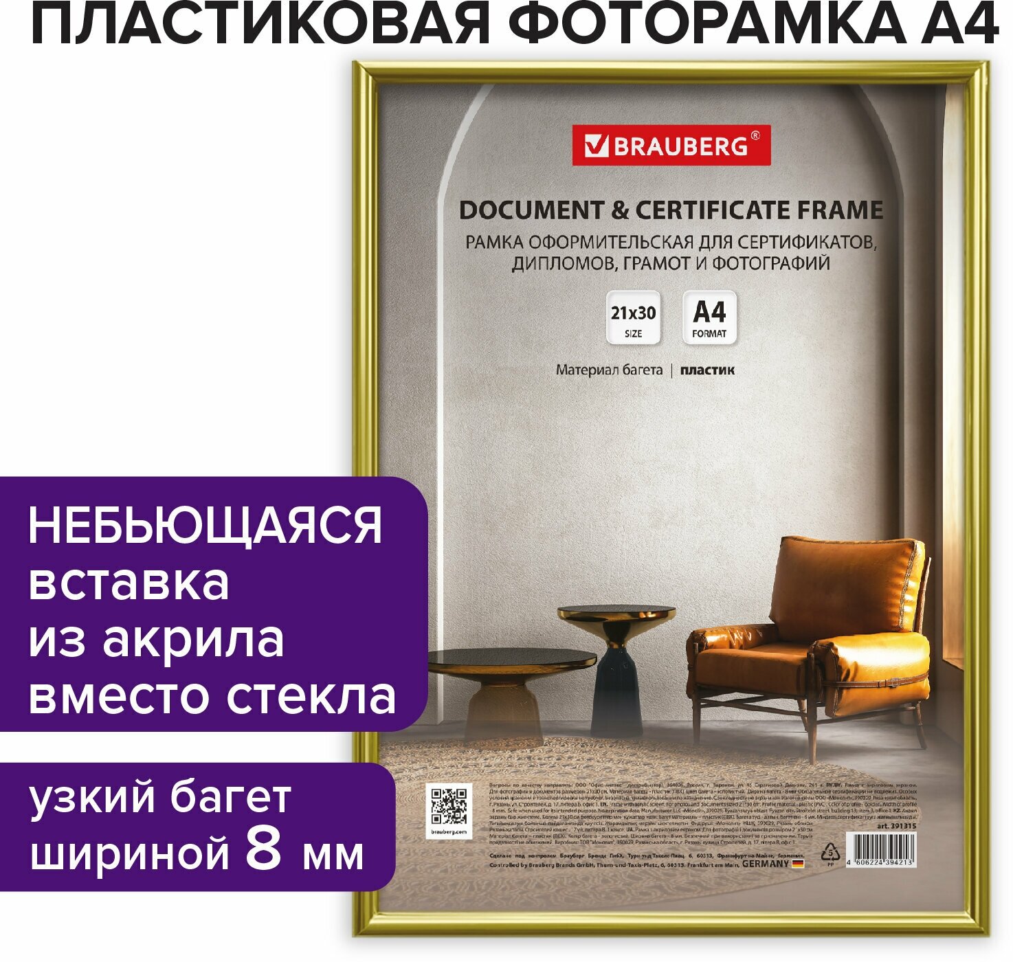 Купить Рамка (фоторамка) для фотографий / картин / грамот 21х30 см золотистая, пластик, багет 8 мм, Brauberg Slim, плотный задник с ножкой, 391315