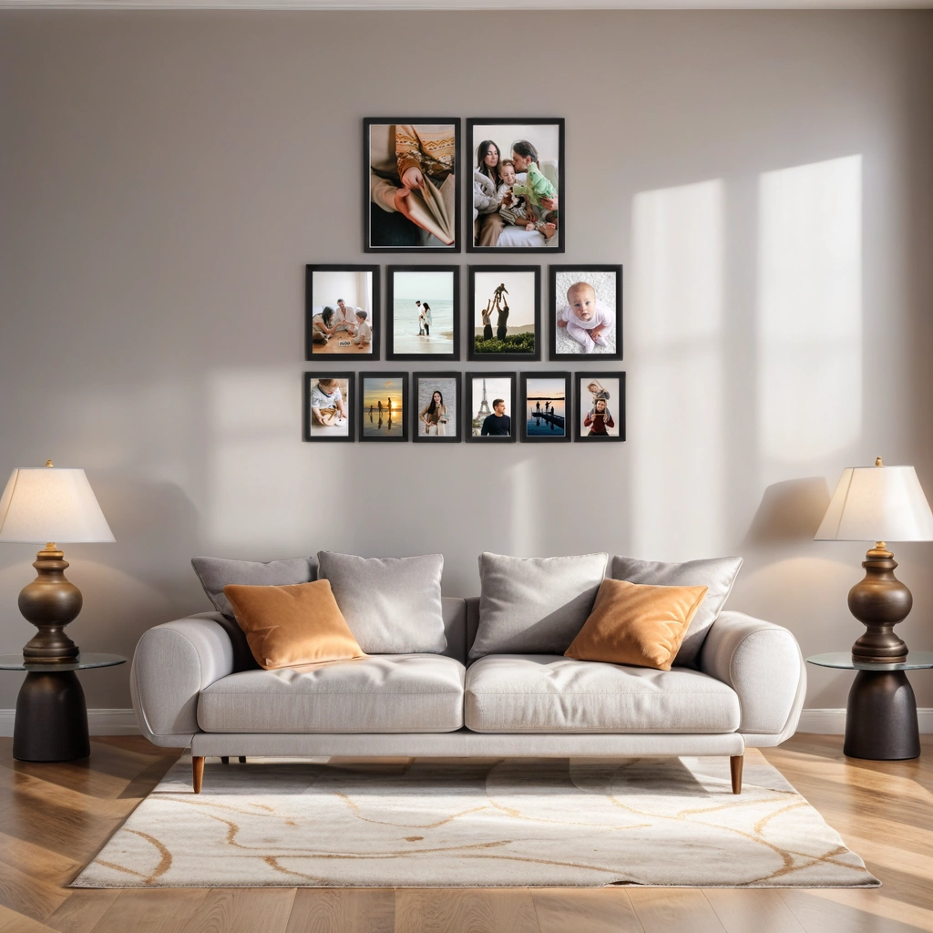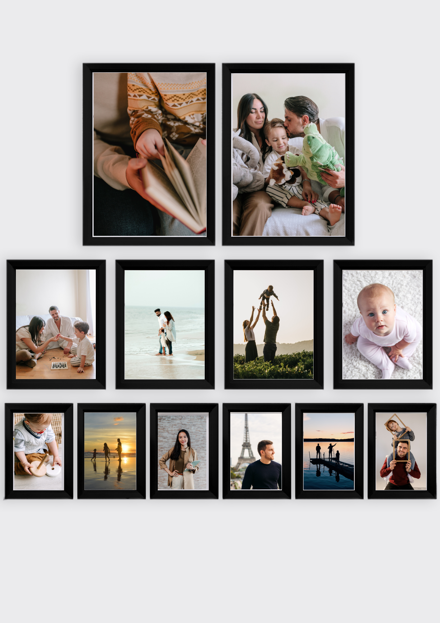 Набор бежевых рамок для фото 12 штук, размеры 21х30 см, 15х21 см, 10х15 см