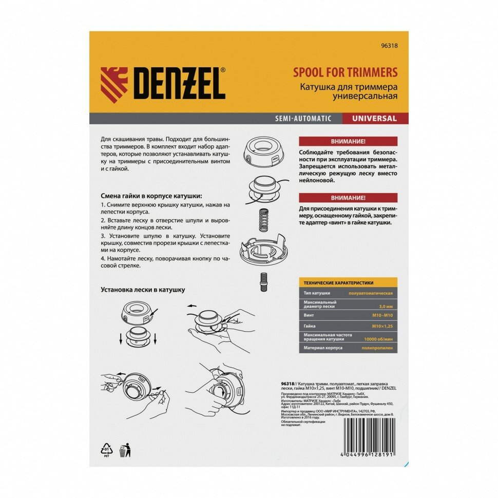 DENZEL Катушка триммерная полуавтоматическая, легкая заправка лески, гайка M10x1,25, винт M10-M10, подшипник Denzel, ( 96318 )