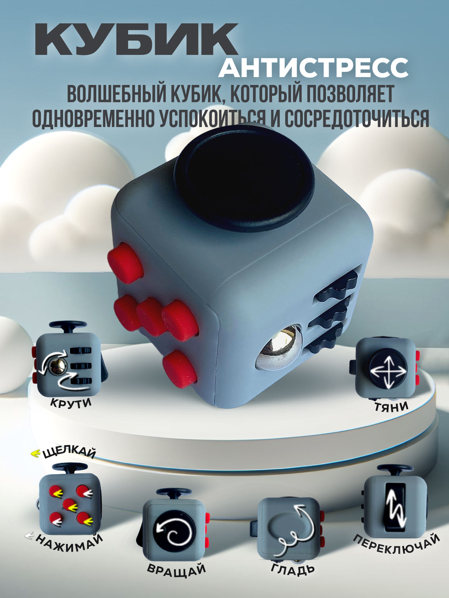 СохранитьКубик антистресс с кнопками для рук успокаивающий фиджет куб fidget Серый с красными интересное: