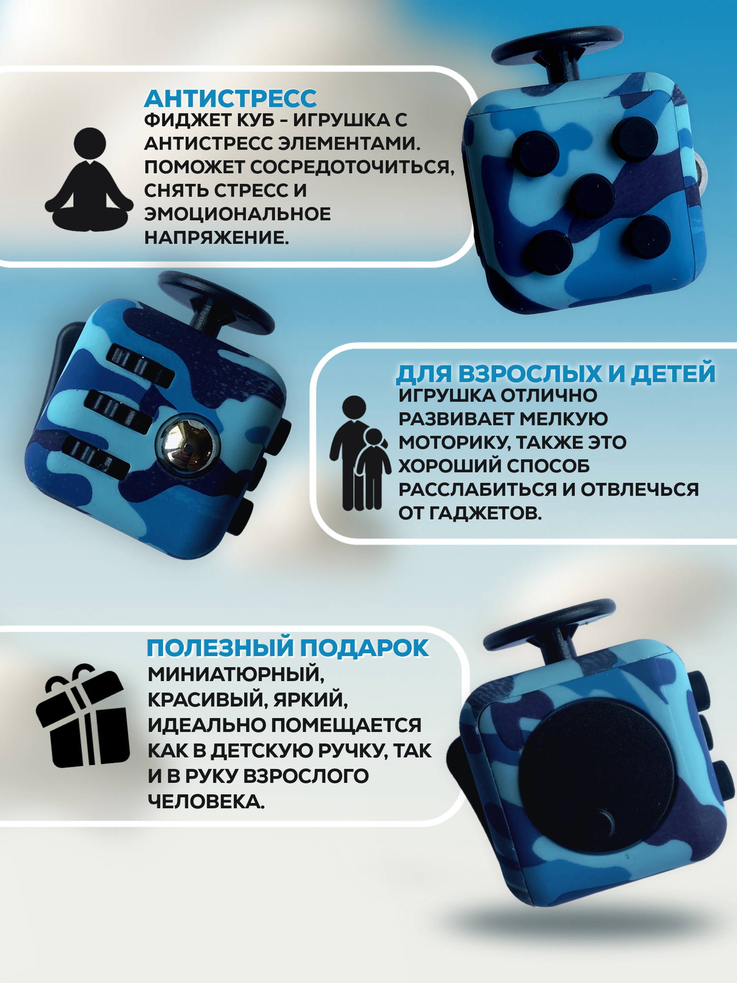 СохранитьКубик антистресс с кнопками для рук успокаивающий фиджет куб fidget Голубой комуфляж интересное: