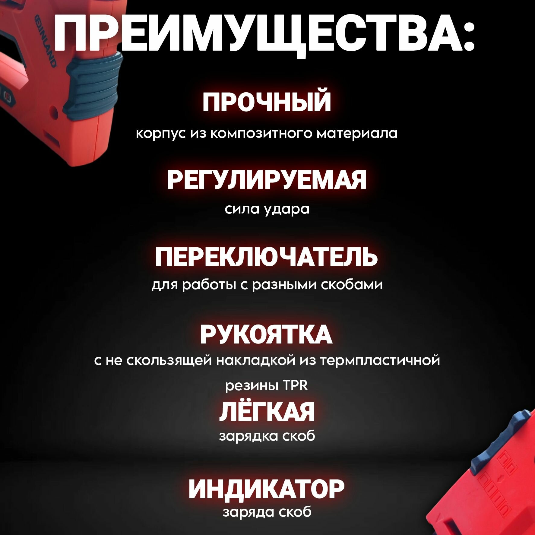 | Особенности | индикатор замены скоб / регулировка силы удара / резиновая рукоять |