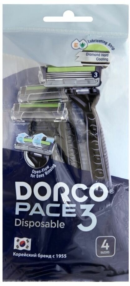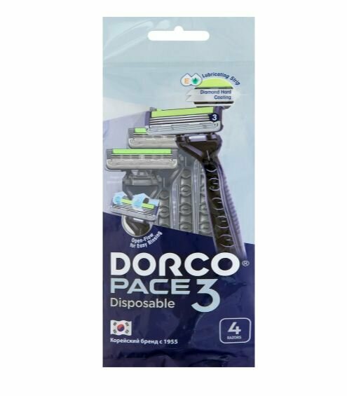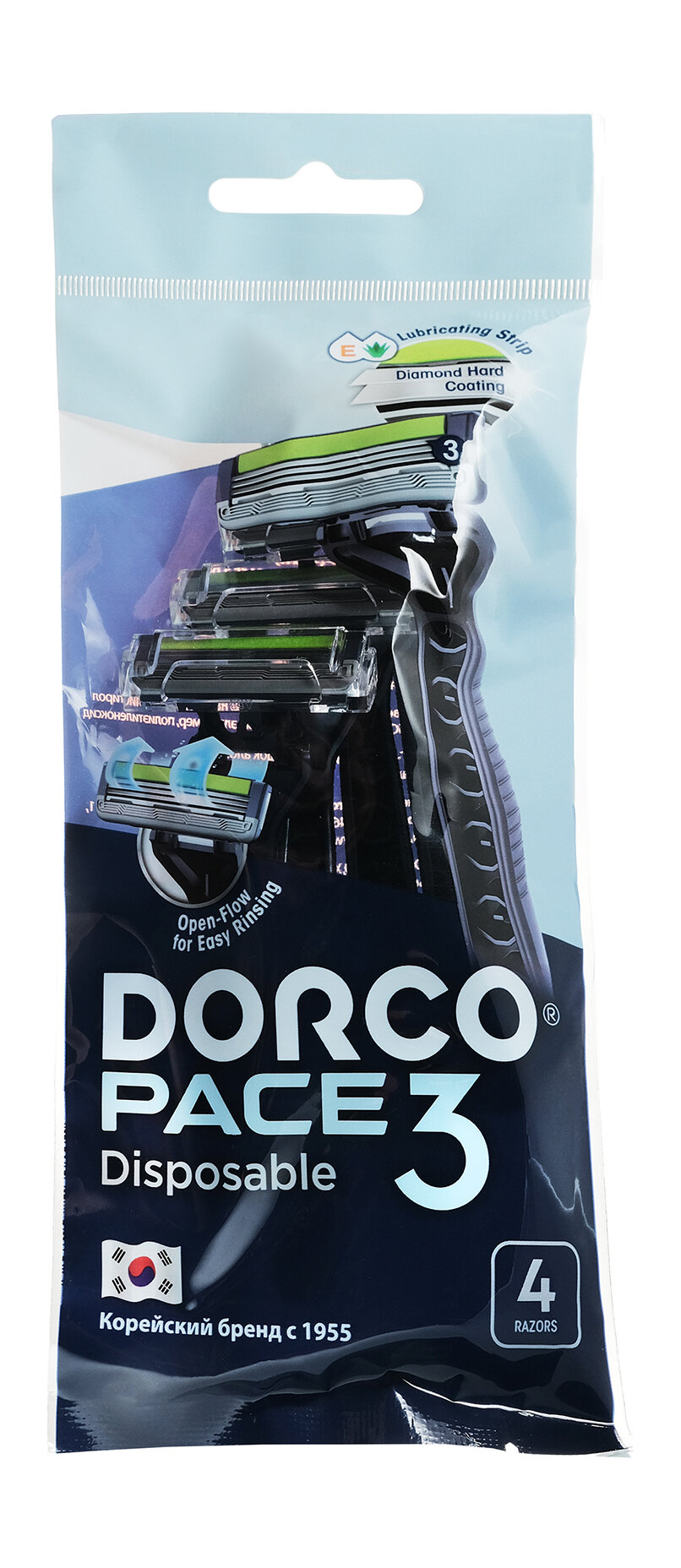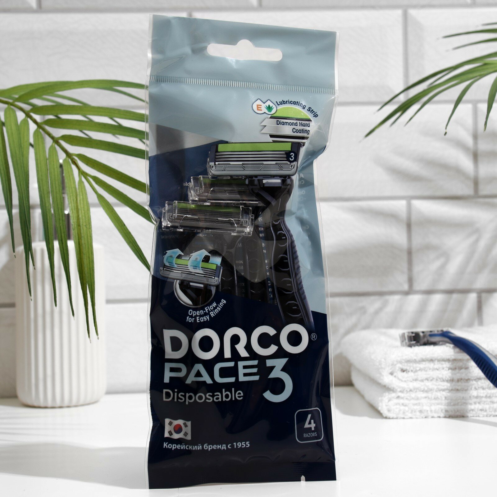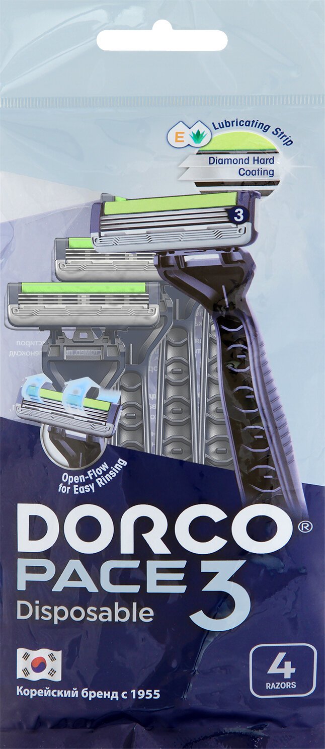Купить Бритвы одноразовые Dorco PACE3, 3-лезвийные, плав.головка, увл.полоса (4 станка)