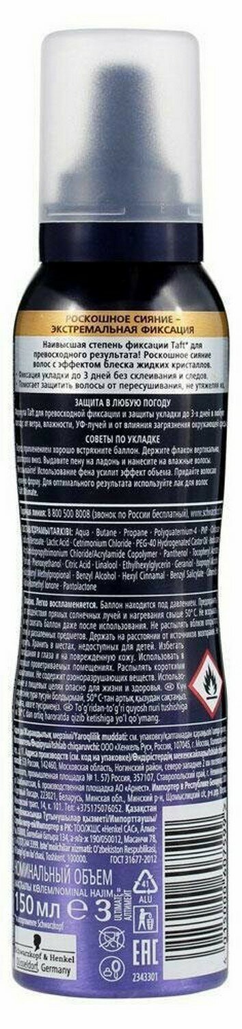 | Способ применения | перед применением хорошо встряхните баллон. Держите флакон вертикально, дозатором вниз.Выдавите пену на ладонь и нанесите на влажные волосы. Придайте волосам нужную форму. ля оптимального результата используйте лак для волос |