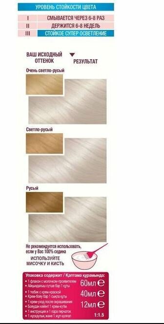 | Комплектация | - флакон с молочком-проявителем (60 мл),- тюбик с обесцвечивающим кремом (40 мл),- крем-уход после окрашивания (10 мл),- инструкция,- пара перчаток |