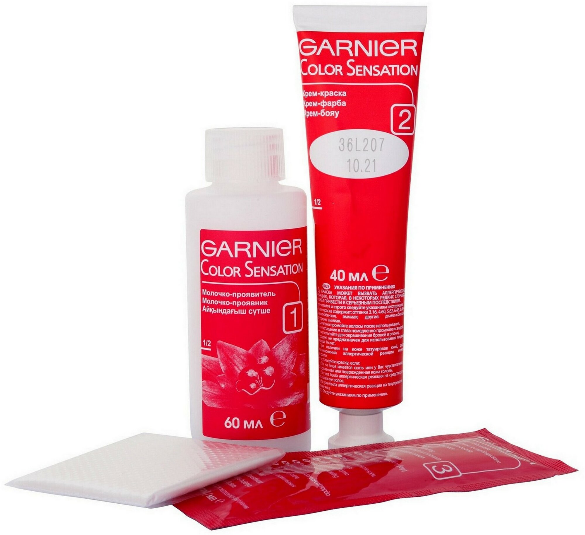 | Комплектация | - флакон с молочком-проявителем (60 мл),- тюбик с обесцвечивающим кремом (40 мл),- крем-уход после окрашивания (10 мл),- инструкция,- пара перчаток |