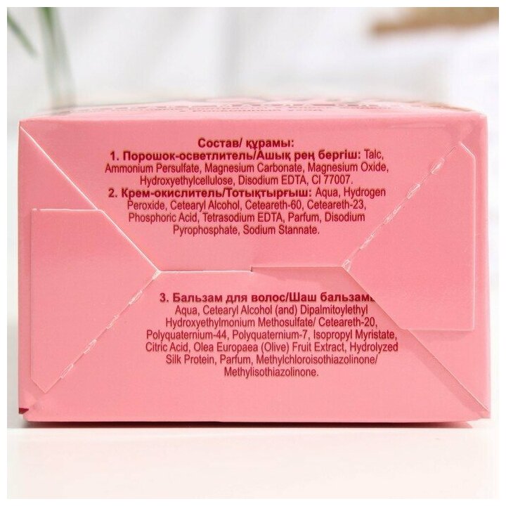 | Комплектация | крем-окислитель, порошок-осветлитель, целебный бальзам, перчатки, шапочка |