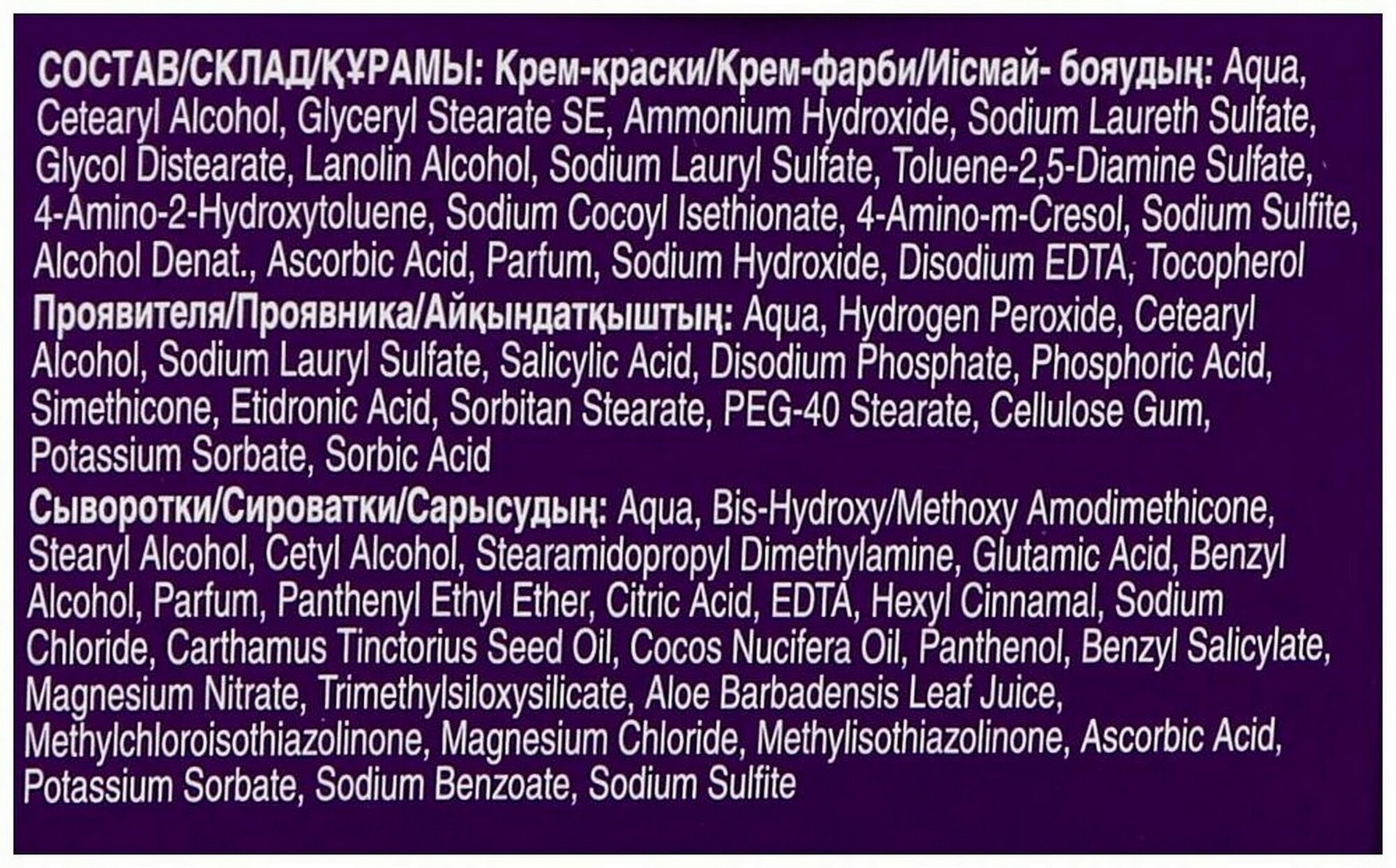 | Способ применения | 1) Приготовьте смесь для окрашивания 2) Нанесите крем-краску только на сухие волосы для получения интенсивного результата, затем смойте по окончании времени воздействия водой 3)Нанесите сыворотку Интенсивный блеск на влажные волосы. Более подробную инструкцию смотрите внутри упаковки. |