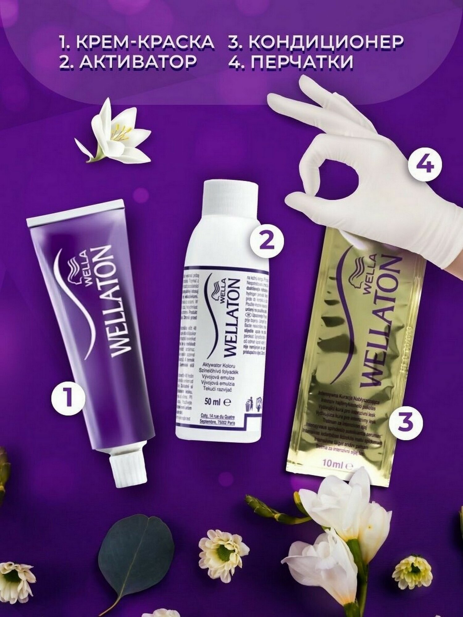 | Комплектация | краситель - 50 мл, проявитель - 50 мл, сыворотка (кондиционер) - 10 мл, пара перчаток, инструкция по применению |