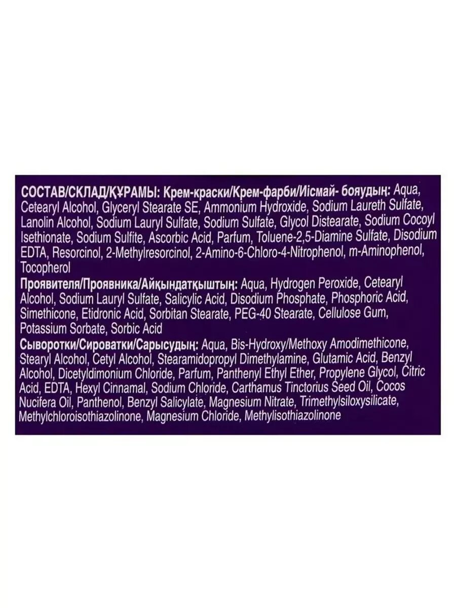 | Способ применения | 1) Приготовьте смесь для окрашивания 2) Нанесите крем-краску только на сухие волосы для получения интенсивного результата, затем смойте по окончании времени воздействия водой 3)Нанесите сыворотку Интенсивный блеск на влажные волосы. Более подробную инструкцию смотрите внутри упаковки. |