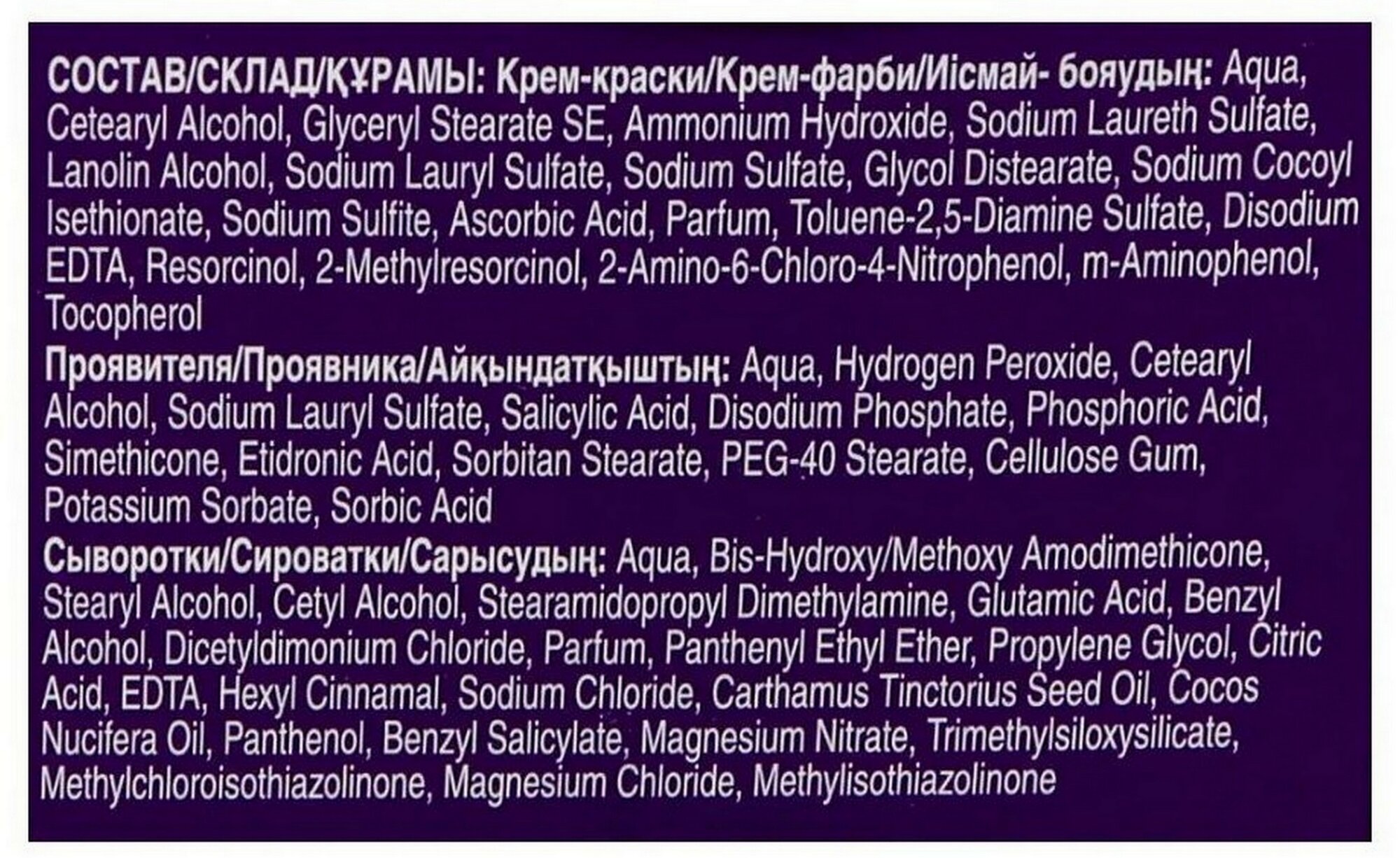 | Не содержит | аммиака / парабенов / полиэтиленгликоля / спирт |