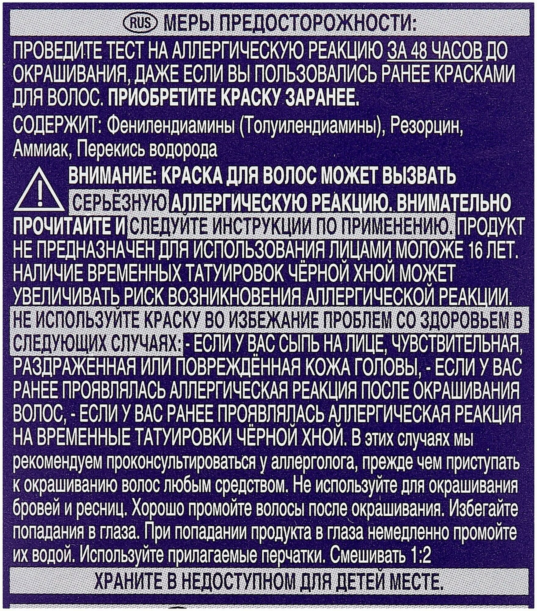 | Способ применения | 1) Приготовьте смесь для окрашивания 2) Нанесите крем-краску только на сухие волосы для получения интенсивного результата, затем смойте по окончании времени воздействия водой 3)Нанесите сыворотку Интенсивный блеск на влажные волосы. Более подробную инструкцию смотрите внутри упаковки. |