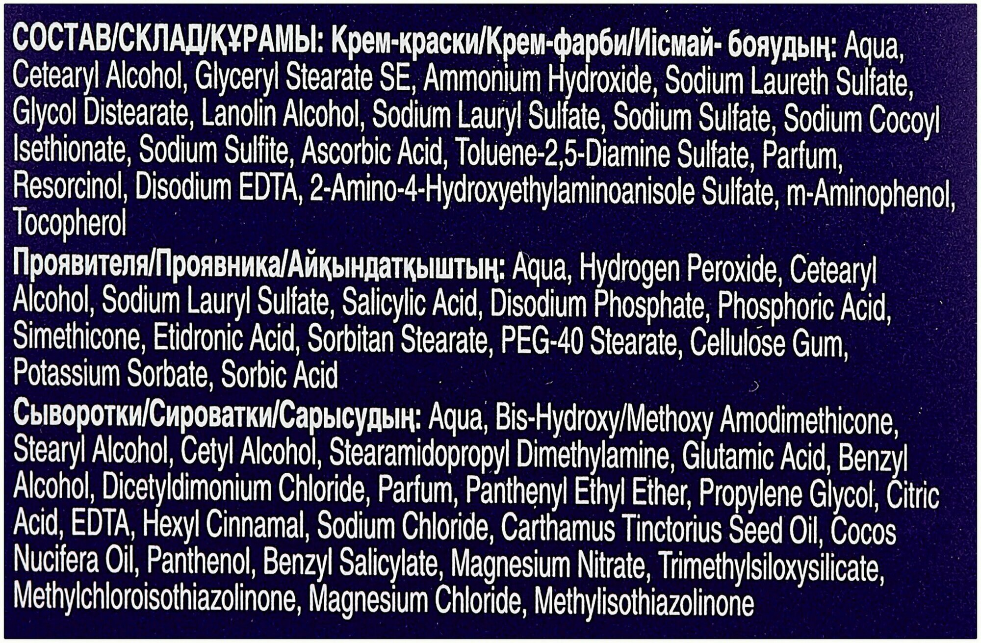 | Способ применения | 1) Приготовьте смесь для окрашивания 2) Нанесите крем-краску только на сухие волосы для получения интенсивного результата, затем смойте по окончании времени воздействия водой 3)Нанесите сыворотку Интенсивный блеск на влажные волосы. Более подробную инструкцию смотрите внутри упаковки. |