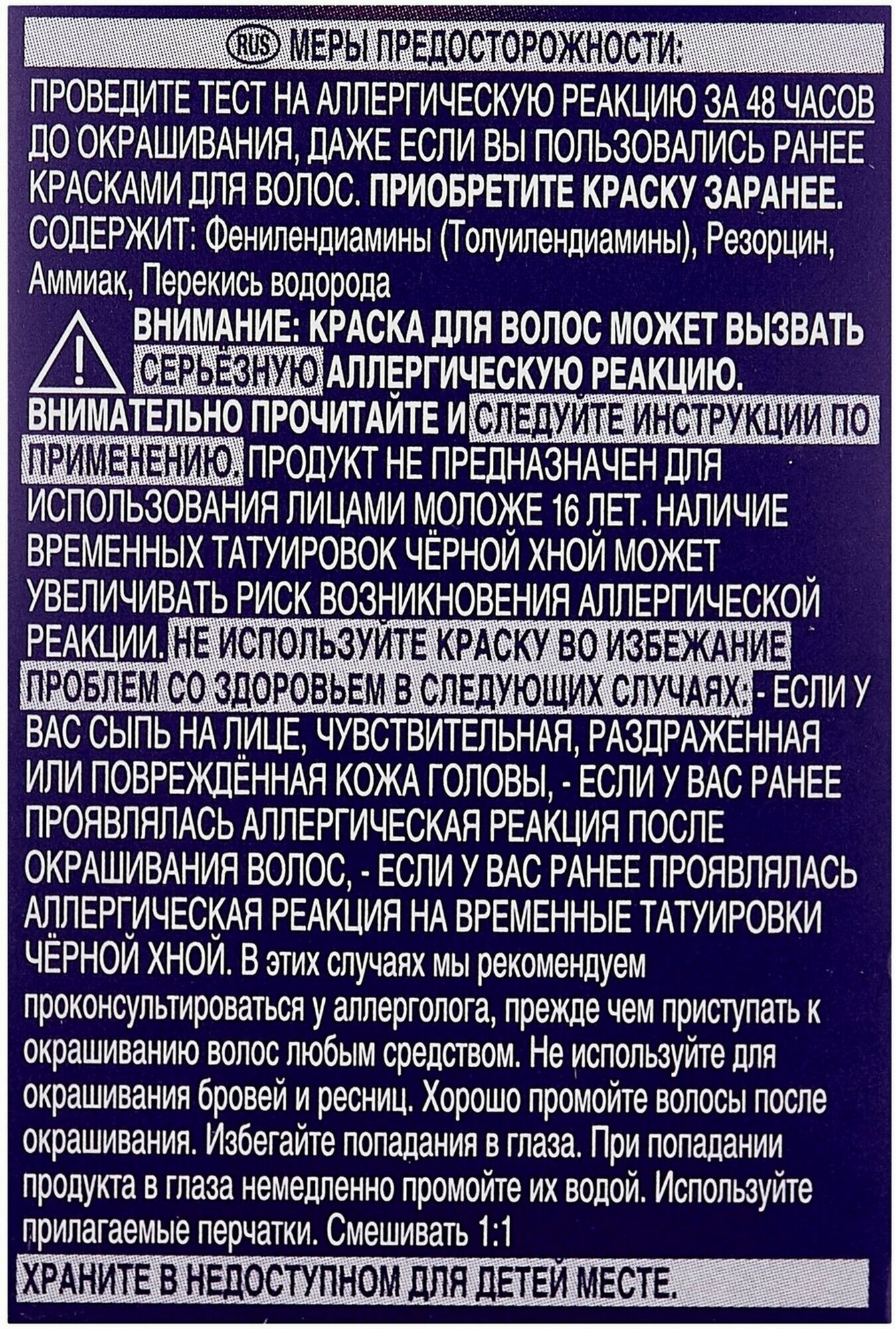 | Способ применения | 1) Приготовьте смесь для окрашивания 2) Нанесите крем-краску только на сухие волосы для получения интенсивного результата, затем смойте по окончании времени воздействия водой 3)Нанесите сыворотку Интенсивный блеск на влажные волосы. Более подробную инструкцию смотрите внутри упаковки. |