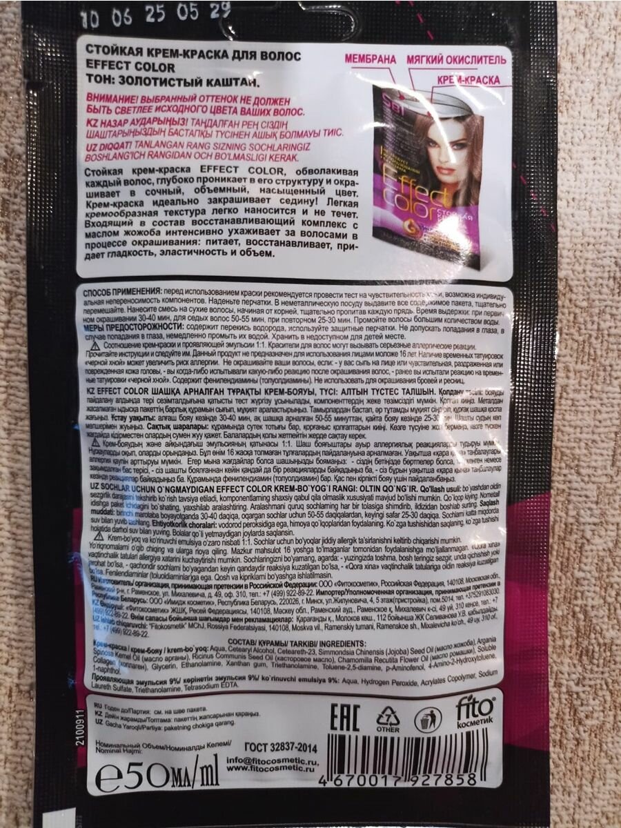 Ниже Вы можете прочитать отзывы на 5в1 Стойкая крем-краска для волос Effect Color 50 мл, тон 5.3 золотистый каштан, ознакомится с подробными характеристиками, посмотреть интересные обзоры и фотографии на 5в1 Стойкая крем-краска для волос Effect Color 50 мл, тон 5.3 золотистый каштан.