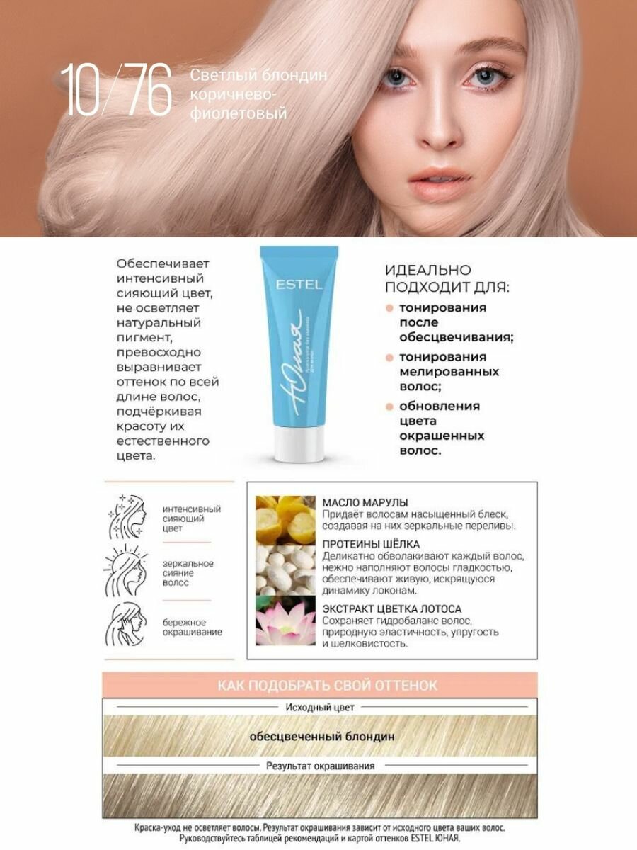 СохранитьESTEL Краска-уход для волос без аммиака юная 10/76 светлый блондин коричнево-фиолетовый интересное: