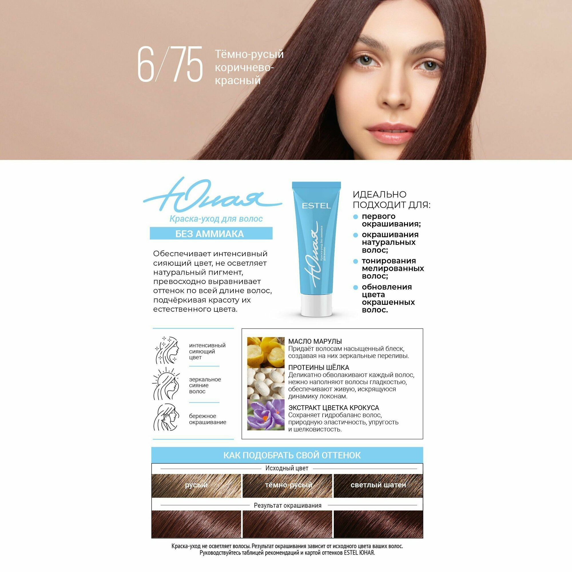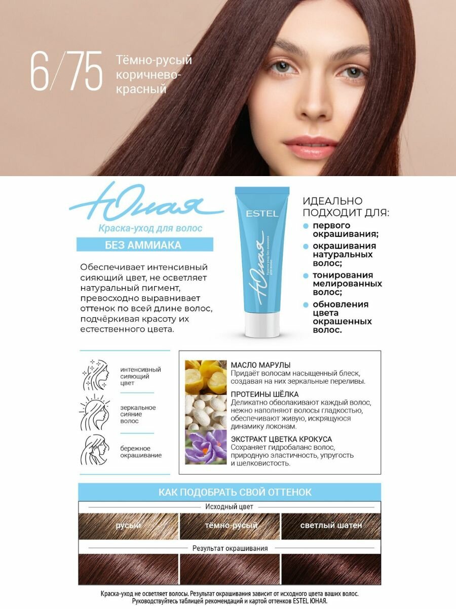 СохранитьESTEL юная Краска-уход без аммиака для волос 6/75 тёмно-русый коричнево-красный интересное: