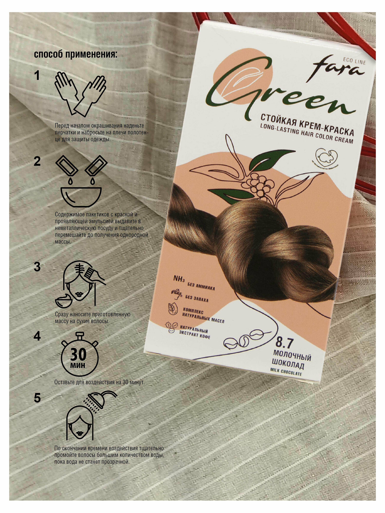 СохранитьСтойкая крем-краска для волос Fara Eco Line Green 8.7 – молочный шоколад интересное: