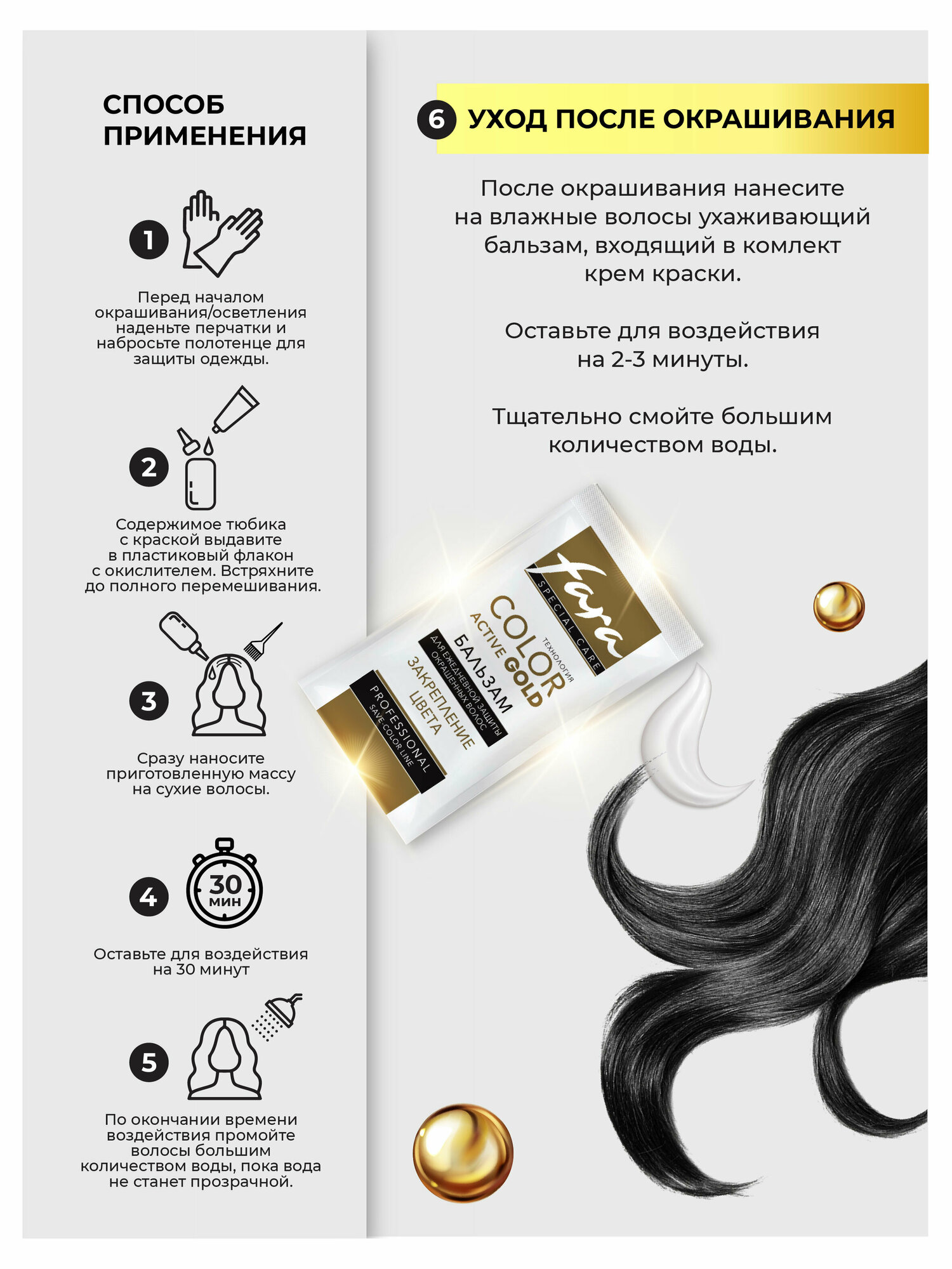 | Способ применения | Нанесите при первом применении.Разделите волосы на отдельные пряди и нанесите красящую массу на все волосы, начиная с корней и наиболее седых участков волос. Используйте весь объем приготовленной смеси. Распределите красящую массу равномерно по волосам с помощью расчески с широкими зубцами. Оставьте для воздействия на 30 минут. По окончании времени воздействия тщательно промойте волосы большим количеством воды, пока вода не станет прозрачной. Нанесите на отросшие корни волос Разделите волосы на отдельные пряди и нанесите 2/3 красящей массы на отросшие корни. Оставьте для воздействия на 20 минут, а затем нанесите и равномерно распределите остаток красящей массы по всей длине волос и подержите ещё 10 минут. По окончании времени воздействия тщательно промойте волосы большим количеством воды, пока вода не станет прозрачной. |