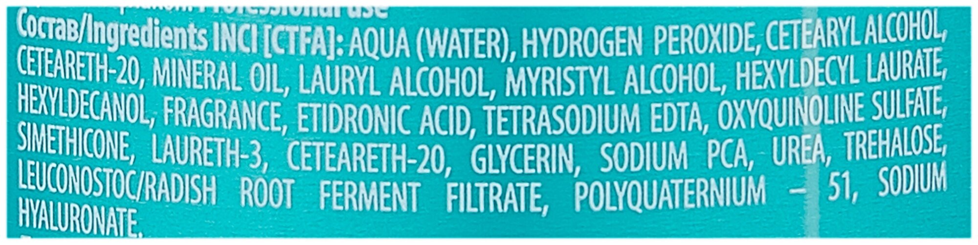 | Состав | Аqua (water), hydrogen peroxide, cetearyl alcohol, ceteareth-20, mineral oil, lauryl alcohol, myristyl alcohol, hexyldecyl laurate, hexyldecanol, fragrance, etidronic acid, tetrasodium edta, oxyquinoline sulfate, simethicone, laureth-3, ceteareth-20, glycerin, sodium pca, urea, trehalose, leuconostoc/radish root ferment filtrate, polyquaternium-51, sodium hyaluronate. |