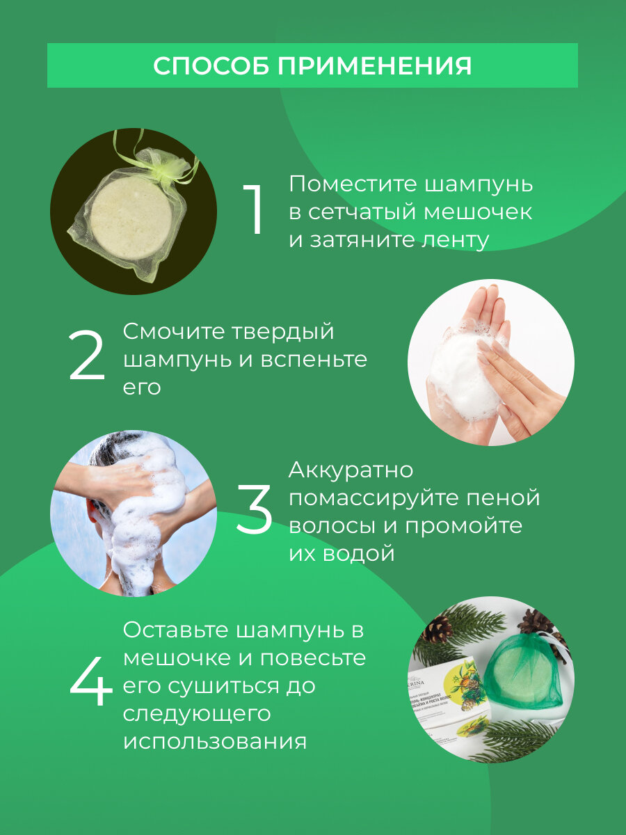 | Способ применения | Поместите шампунь в сетчатый мешочек и затяните ленту. Смочите твердый шампунь и вспеньте его. Аккуратно помассируйте пеной волосы и промойте их водой. Оставьте шампунь в мешочке и повесьте его сушиться до следующего использования. |