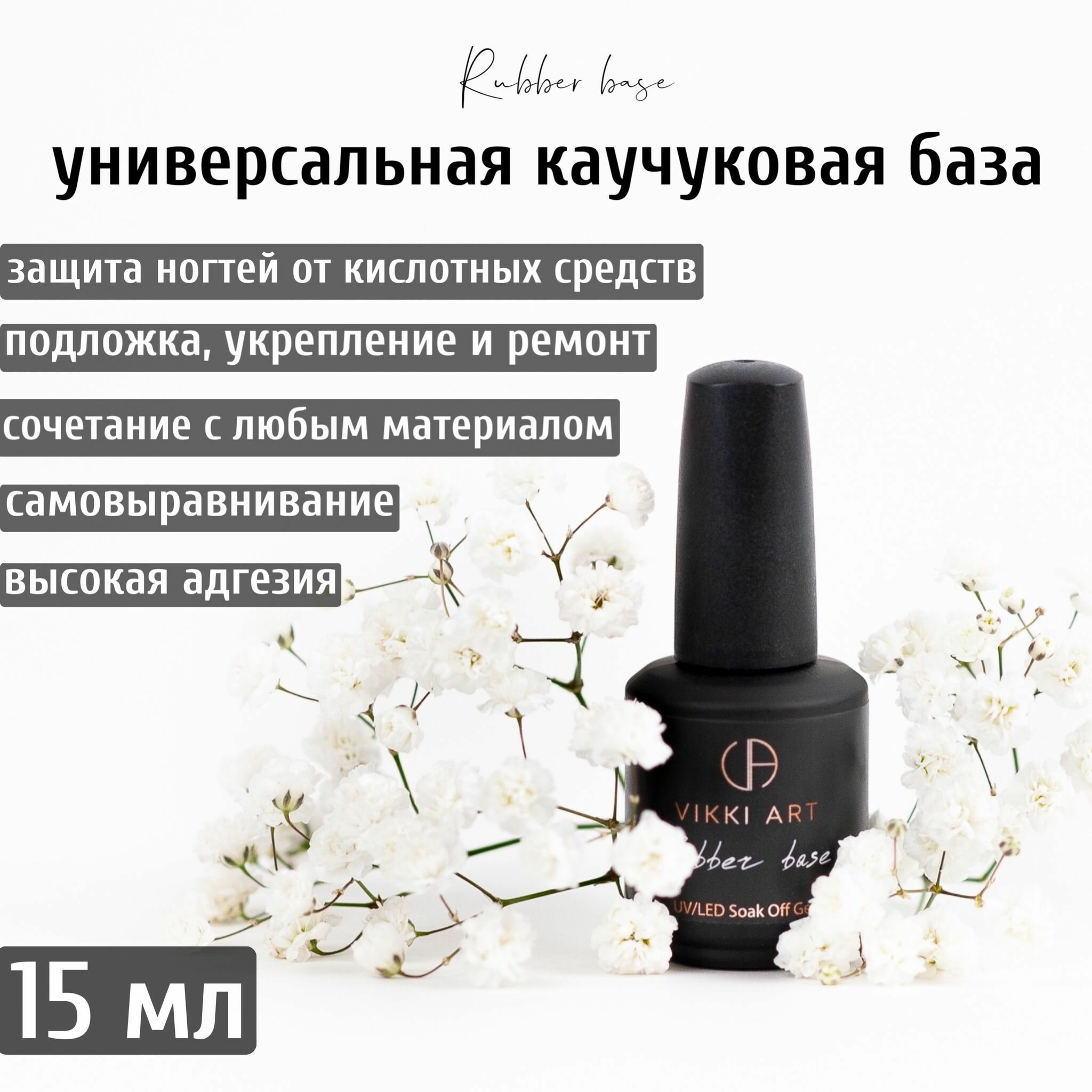 Купить VIKKIART RUBBER BASE, 15мл / База для гель лака прозрачная каучуковая 10 в 1, для подложки, укрепления и ремонта