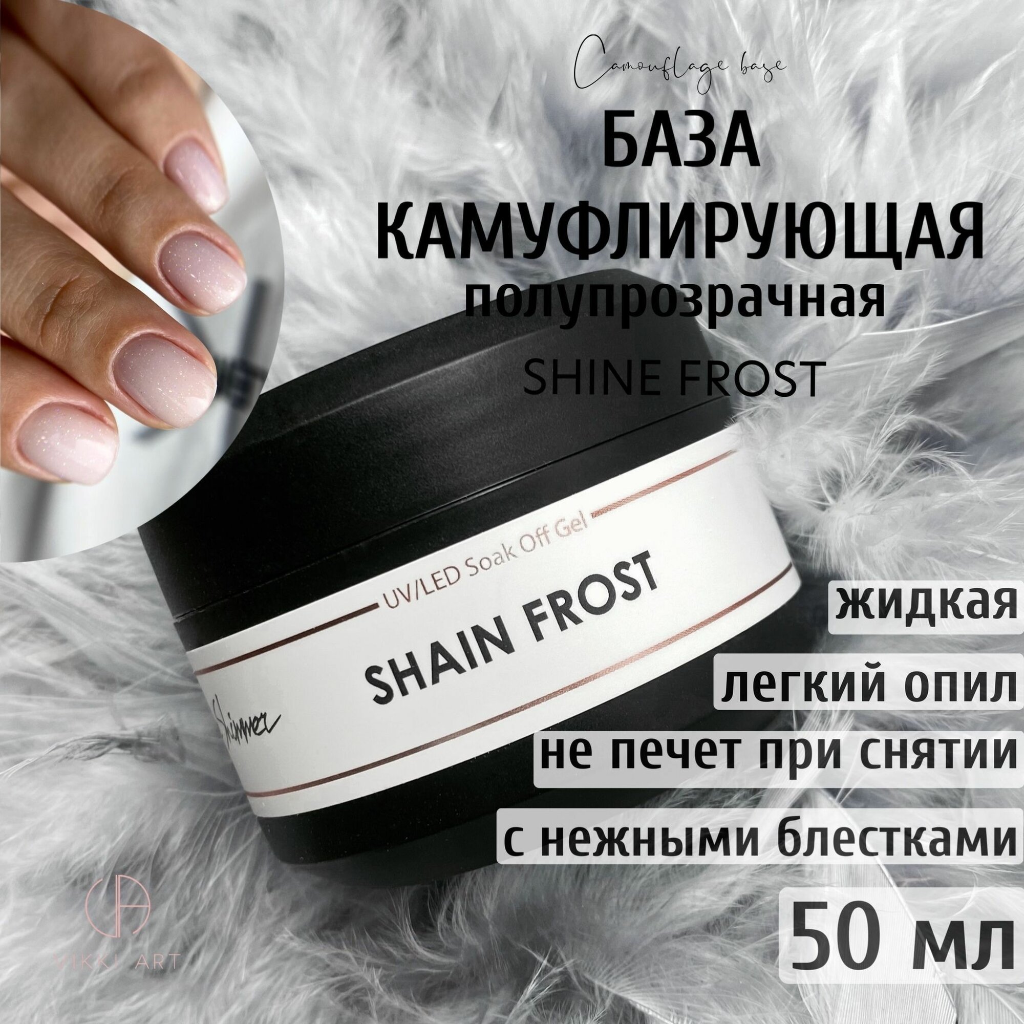 Купить VIKKIART Shimmer Shine Frost, 50 мл / База для гель лака белая полупрозрачная камуфлирующая каучуковая с блестками, молочная основа для гель лака