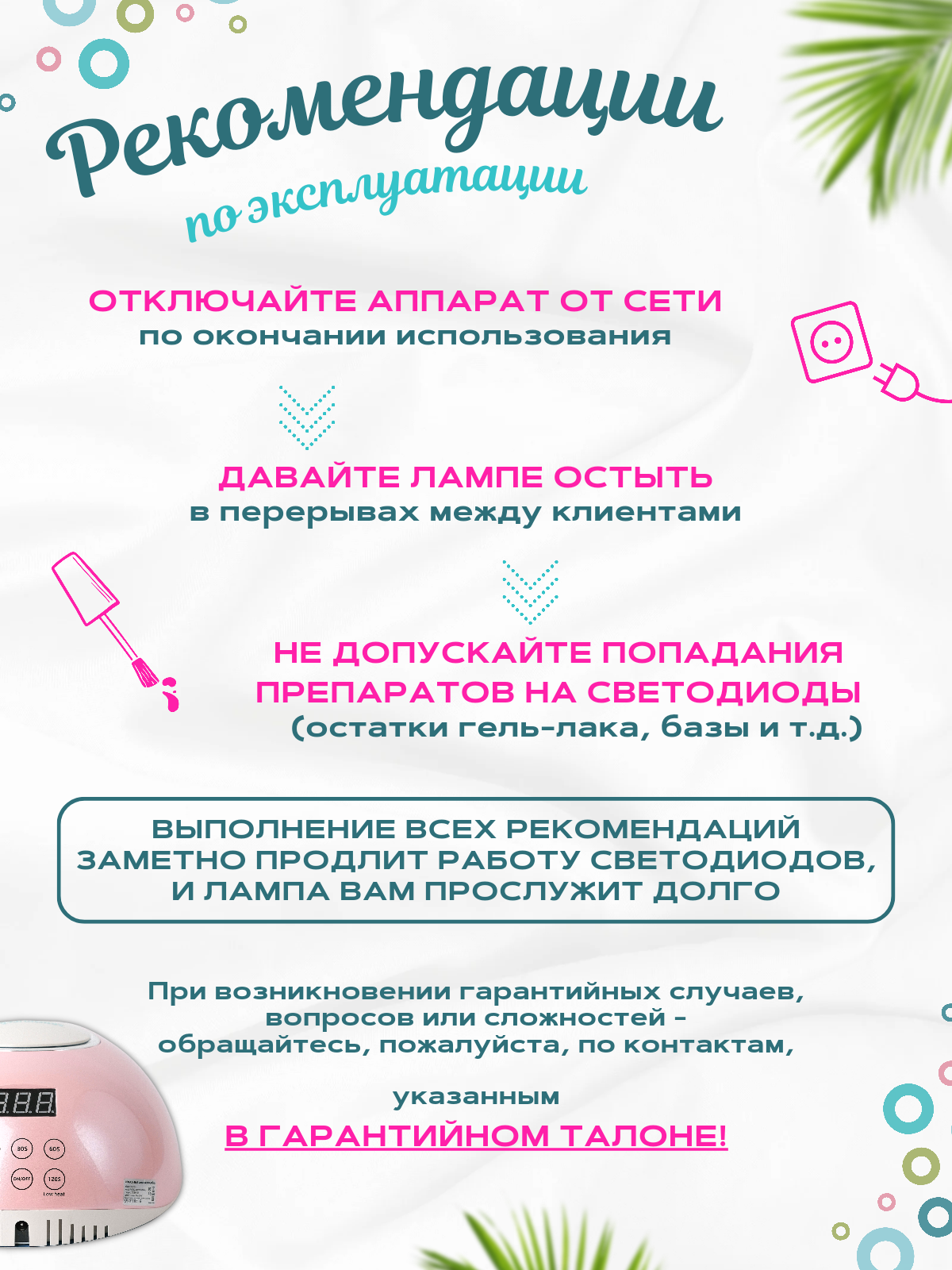 | Комплектация | Лампа для сушки ногтей-1 шт, Кабель-1 шт, Инструкция/ Гарантийный талон-1 шт |