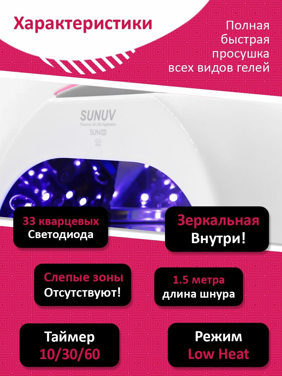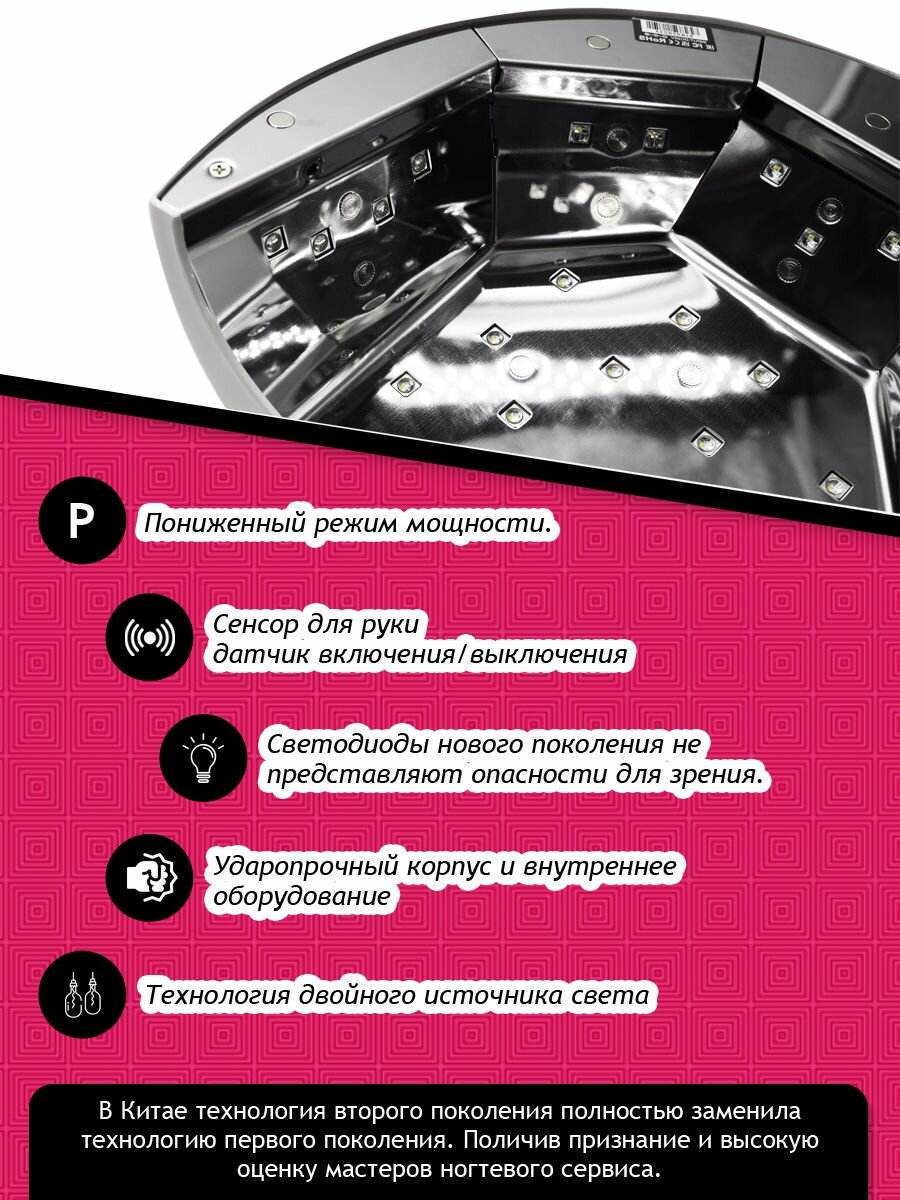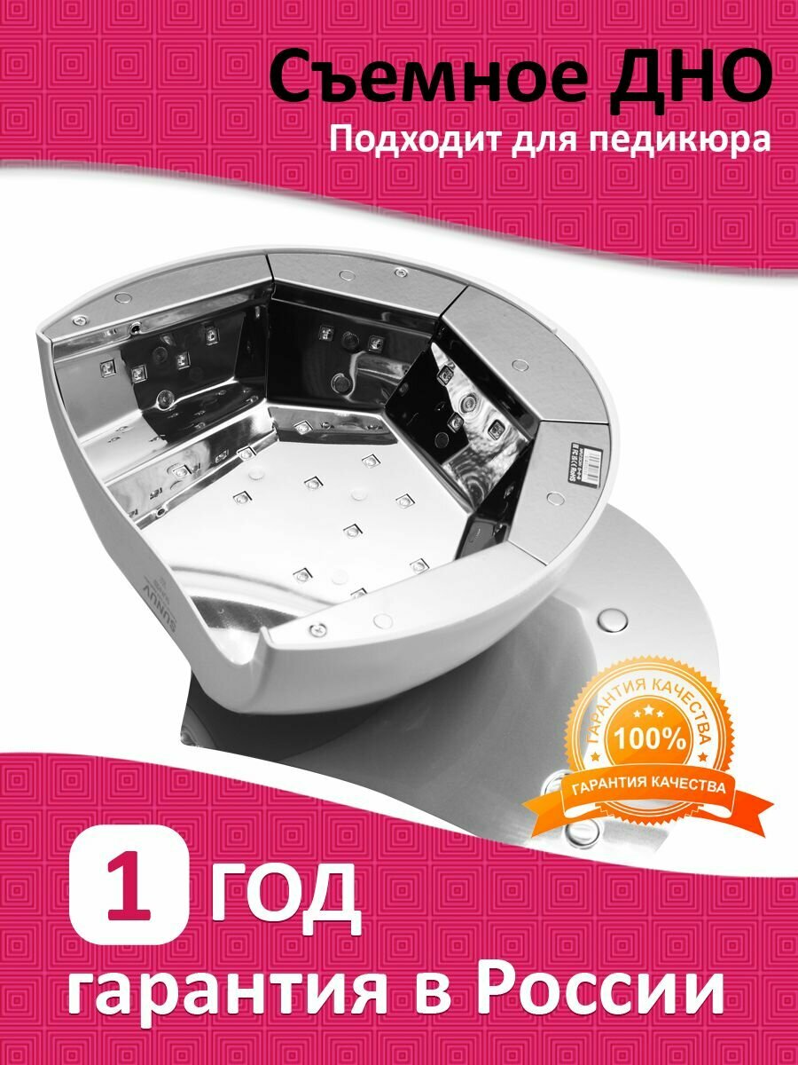 | Особенности | зеркальный отражатель / подходит для педикюра / сенсорное включение / съемное дно |