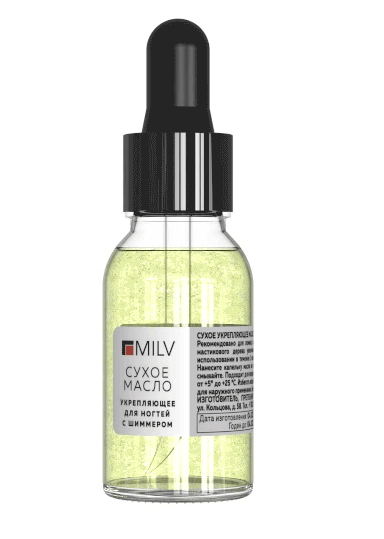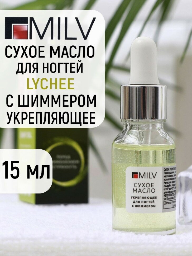 | Комплектация | Сухое укрепляющее масло для ногтей Milv Lychee, с шиммером, 15 мл |