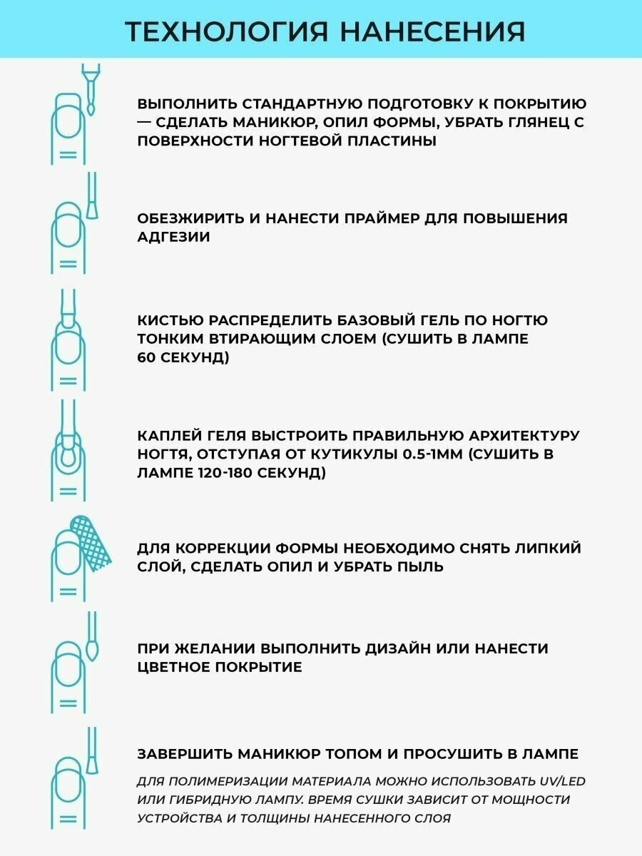 | Способ применения | База: нанести на подготовленный ноготь тонким слоем втирающими движениями. Сушить 30-60 секунд. Моделирование: выкладывать мягкими движениями, не давить на кисть, по технике выравнивания гель-лаком. При необходимости перевернуть палец и дать гелю распределиться. Сушить 60-90 секунд. При работе в технике без опила рекомендуется после полимеризации скульптуры подпилить торцы, открыв немного толщины. Финиш: наносить тонким слоем мягкой кистью. Сушить не меньше двух минут. Дать гелю остыть, затем снимать дисперсию. Для получения более интенсивного глянца рекомендуется перекрывать гель топом. |