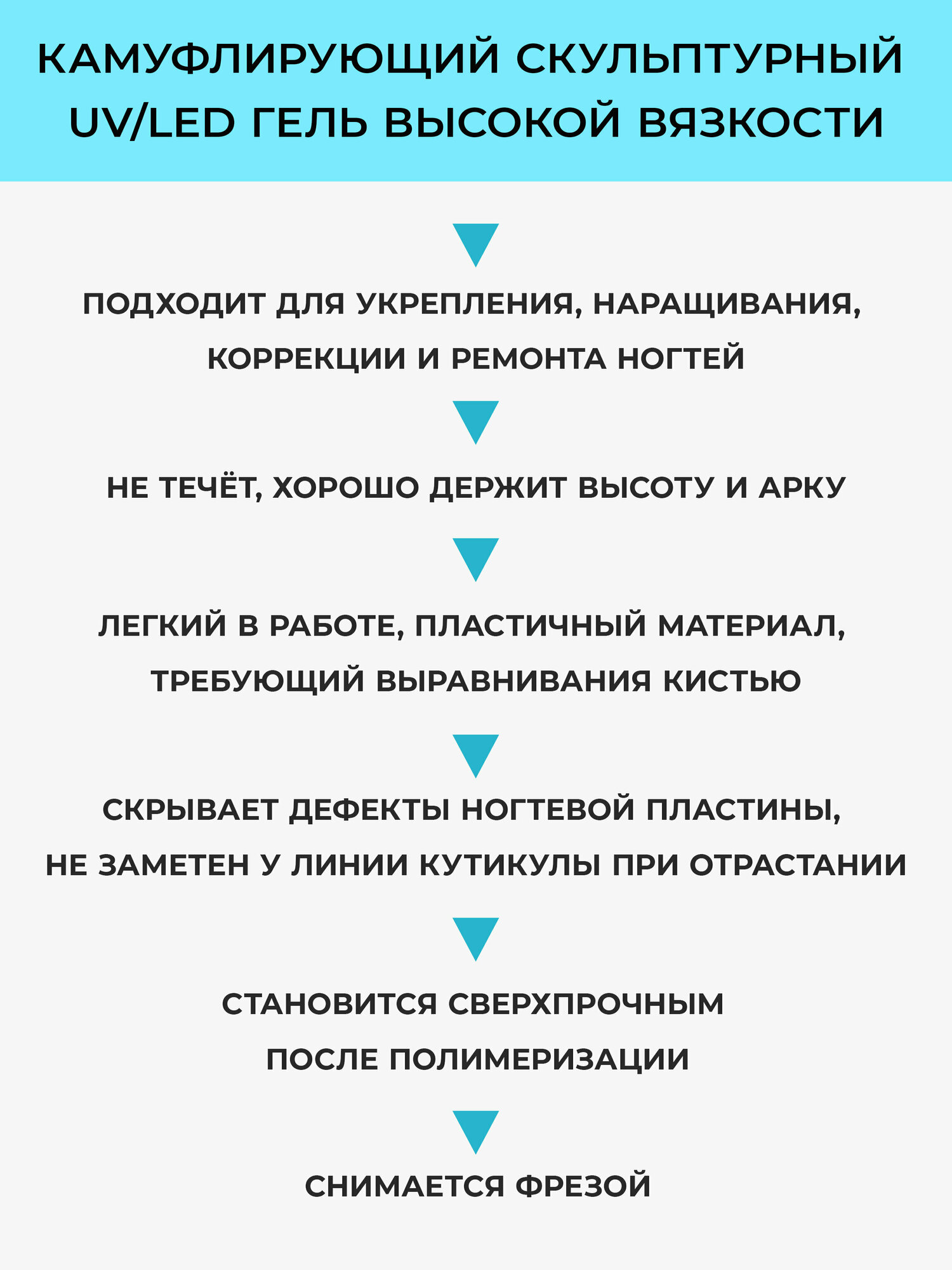 | Способ применения | База: нанести на подготовленный ноготь тонким слоем втирающими движениями. Сушить 30-60 секунд. Моделирование: выкладывать мягкими движениями, не давить на кисть, по технике выравнивания гель-лаком. При необходимости перевернуть палец и дать гелю распределиться. Сушить 60-90 секунд. При работе в технике без опила рекомендуется после полимеризации скульптуры подпилить торцы, открыв немного толщины. Финиш: наносить тонким слоем мягкой кистью. Сушить не меньше двух минут. Дать гелю остыть, затем снимать дисперсию. Для получения более интенсивного глянца рекомендуется перекрывать гель топом. |
