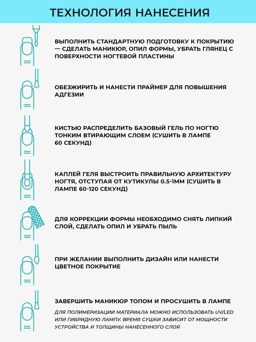 | Способ применения | База: нанести на подготовленный ноготь тонким слоем втирающими движениями. Сушить 30-60 секунд. Моделирование: выкладывать мягкими движениями, не давить на кисть, по технике выравнивания гель-лаком. При необходимости перевернуть палец и дать гелю распределиться. Сушить 60-90 секунд. При работе в технике без опила рекомендуется после полимеризации скульптуры подпилить торцы, открыв немного толщины. Финиш: наносить тонким слоем мягкой кистью. Сушить не меньше двух минут. Дать гелю остыть, затем снимать дисперсию. Для получения более интенсивного глянца рекомендуется перекрывать гель топом. |