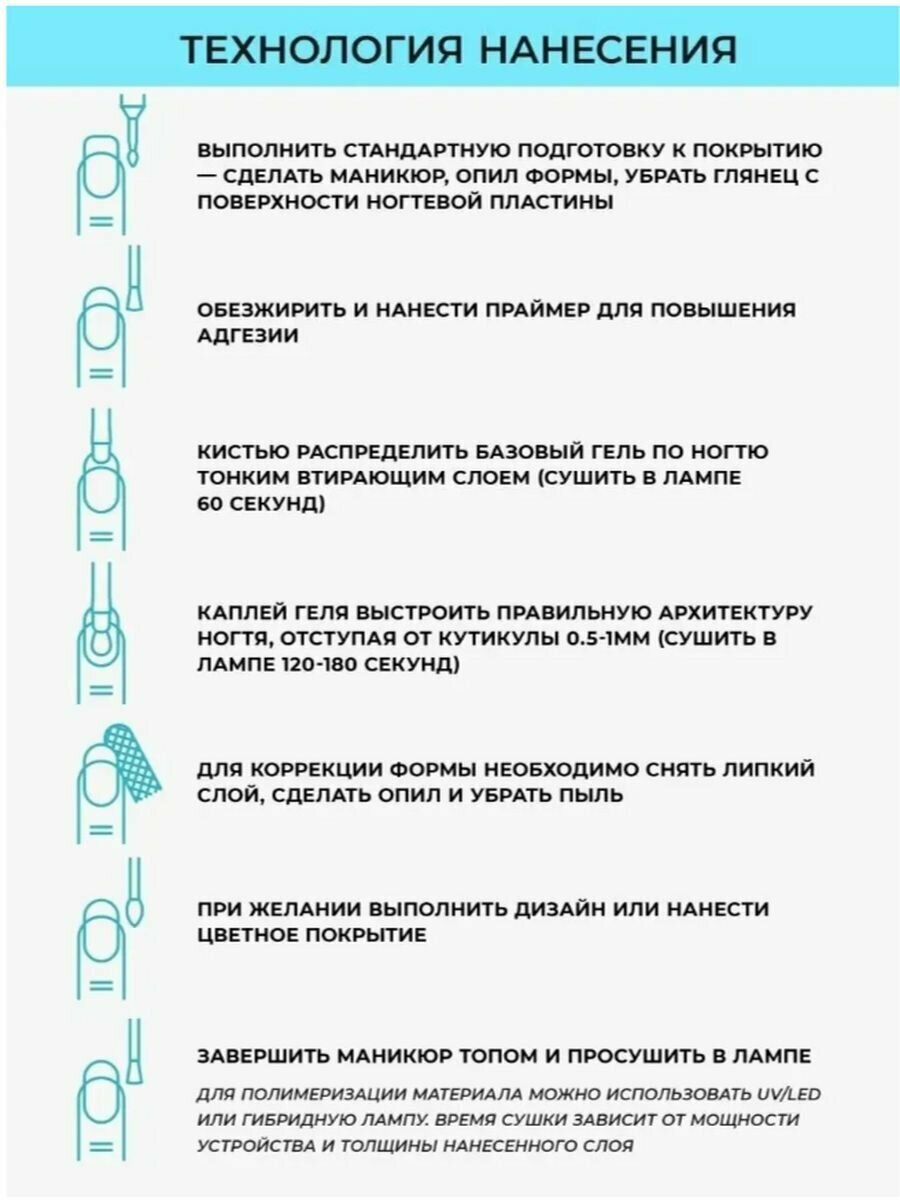 | Способ применения | База: нанести на подготовленный ноготь тонким слоем втирающими движениями. Сушить 30-60 секунд. Моделирование: выкладывать мягкими движениями, не давить на кисть, по технике выравнивания гель-лаком. При необходимости перевернуть палец и дать гелю распределиться. Сушить 60-90 секунд. При работе в технике без опила рекомендуется после полимеризации скульптуры подпилить торцы, открыв немного толщины. Финиш: наносить тонким слоем мягкой кистью. Сушить не меньше двух минут. Дать гелю остыть, затем снимать дисперсию. Для получения более интенсивного глянца рекомендуется перекрывать гель топом. |