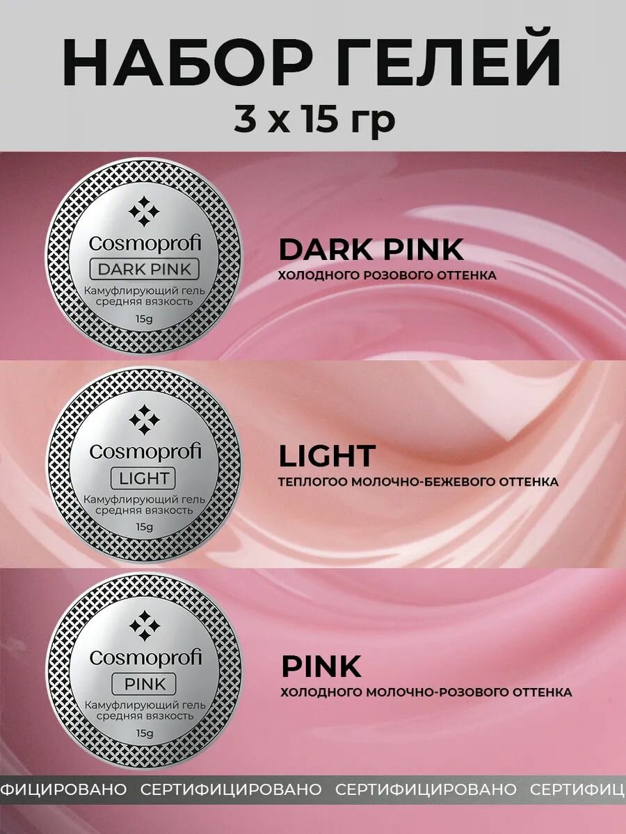 Набор лаков Cosmoprofi, Гели для моделирования и наращивания Milky Beige, Milky Nude, Dark Pink 15 грамм