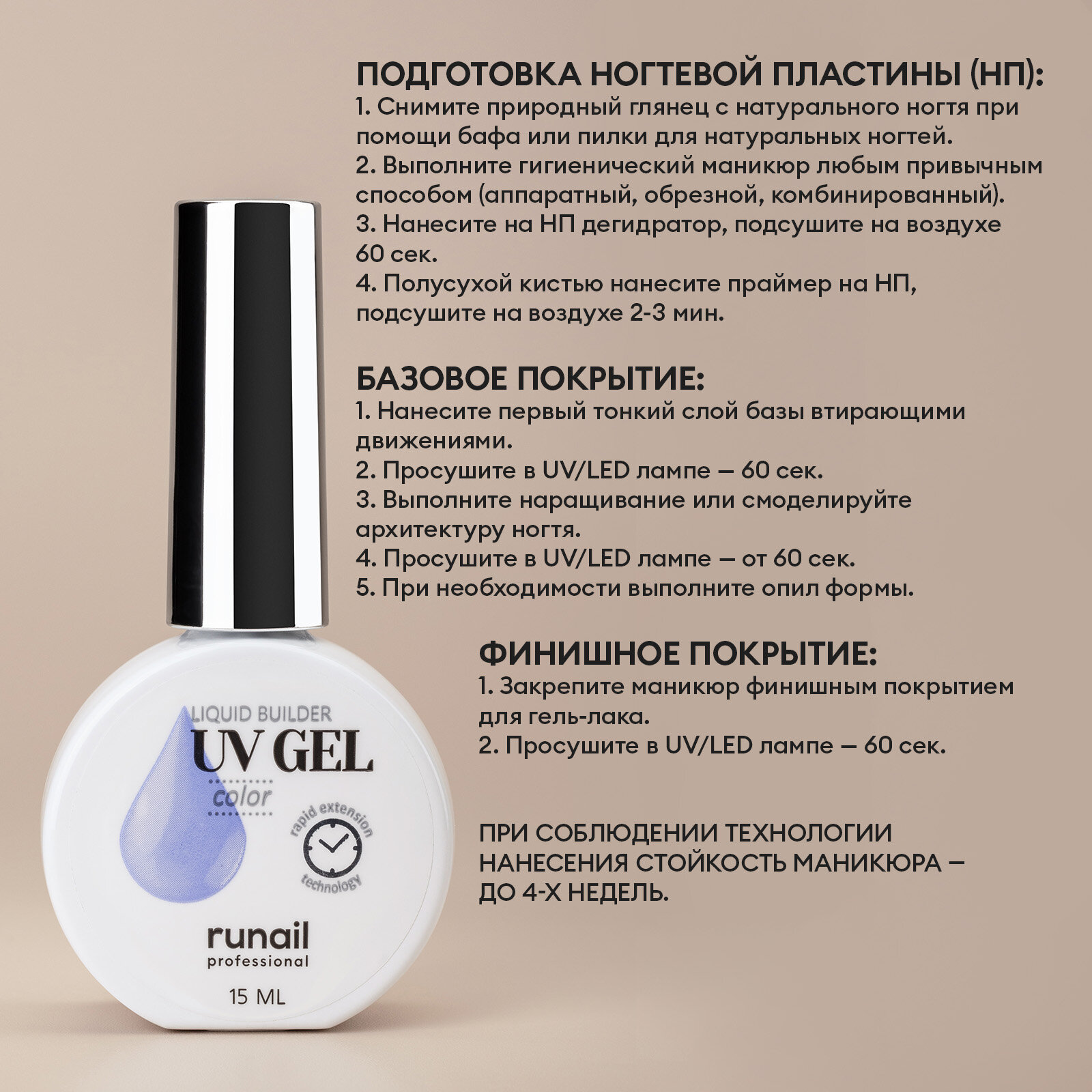 | Способ применения | Подготовка ногтевой пластины (НП): 1. Снимите природный глянец с натурального ногтя при помощи бафа или пилки для натуральных ногтей. 2. Выполните гигиенический маникюр любым привычным способом (аппаратный, обрезной, комбинированный). 3. Нанесите на НП дегидратор, подсушите на воздухе 60 сек. 4. Полусухой кистью нанесите праймер на НП, подсушите на воздухе 2-3 мин. Базовое покрытие: 1. Нанесите первый базовый слой втирающими движениями. 2. Просушите в UV/LED лампе - 60 сек. 3. Выполните наращивание или смоделируйте архитектуру ногтя. 4. Просушите в UV/L ED лампе - от 60 сек. 5. При необходимости выполните опил формы. Финишное покрытие: 1. Закрепите маникюр финишным покрытием. 2. Просушите в UV/LED лампе - от 60 сек. При соблюдении технологии нанесения стойкость маникюра - до 4-Х недель. |