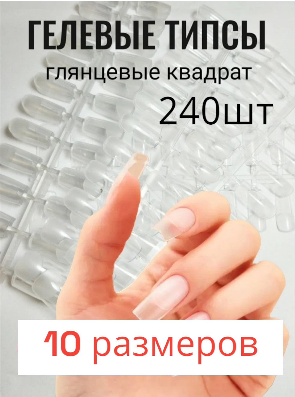 Гелевые типсы "Квадрат" 240 штук для наращивания ногтей, глянцевые с лункой интересное:
