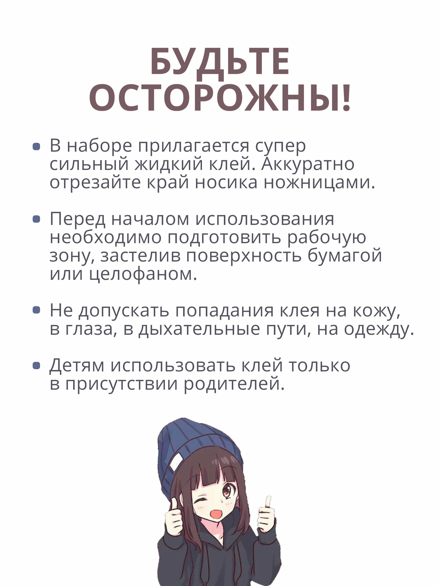 | Дополнительная информация | В наборе прилагается супер сильный жидкий клей. Перед началом использования необходимо подготовить рабочую зону, застелив поверхность бумагой или целофаном. Не допускать попадания клея на кожу, в глаза, в дыхательные пути, на одежду. Детям использовать клей только в присутствии родителей. |