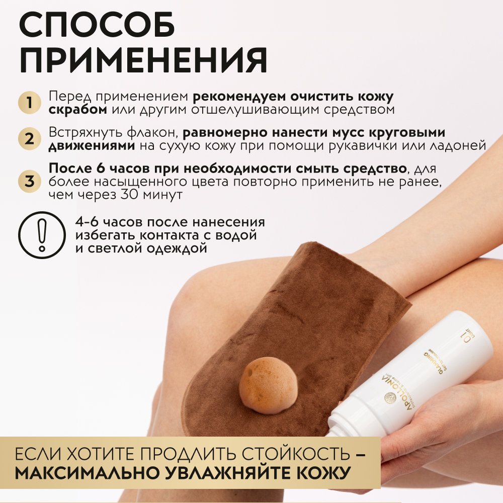 | Способ применения | Перед использованием встряхните закрытый флакон. Рекомендуем очистить кожу скрабом или другим отшелушивающим средством перед нанесением. Нанесите мусс равномерно круговыми движениями на сухую чистую кожу при помощи рукавички или рук. После нанесения избегайте контакта кожи с водой и светлой одеждой в течение 4-6 часов. По истечении 6 часов средство можно смыть теплой водой. Для более насыщенного цвета возможно повторное применение средства не ранее, чем через 30 минут. |