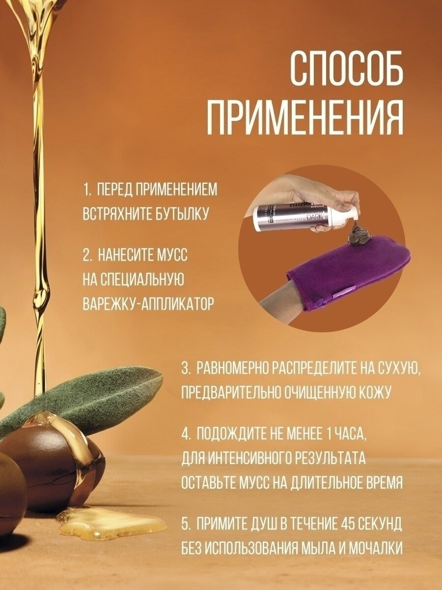 | Способ применения | Перед применением встряхнуть бутылку. Нанесите мусс на специальную варежку - аппликатор, равномерно распределите на сухую, предварительно очищенную кожу. Подождите не менее 1 часа, затем примите душ в течение 45 секунд без использования мыла и мочалки. Для получения интенсивного результата оставьте мусс на более длительное время. |