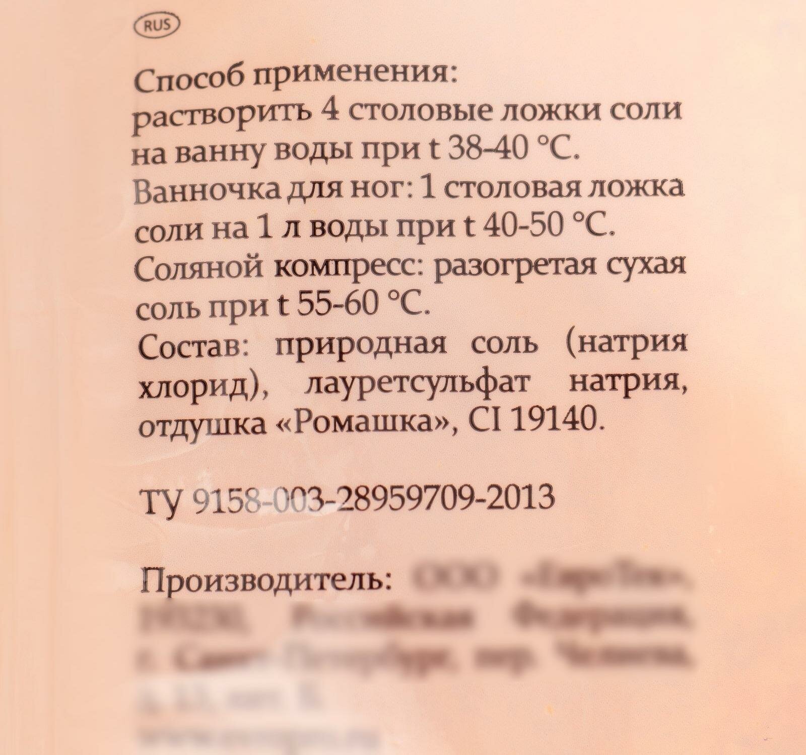 | Способ применения | растворить 4 столовые ложки соли на ванну воды при t 38-40 °С. Ванна для ног: растворить 1 столовую ложку соли на 1 л воды при t 40-50 °С. Соляной компресс: разогретая сухая соль при t 55-60 °C |