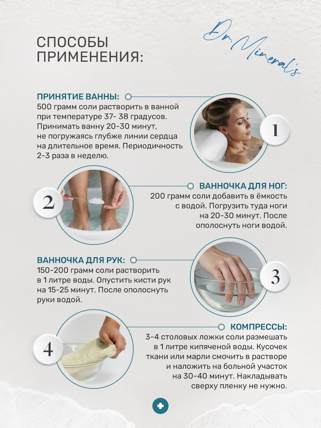 | Способ применения | От 500 до 1000 грамм соли растворить в ванне с температурой 36-38 градусов. Для достижения лучшего эффекта - на ванну (обычно 200 литров воды) добавить 1000 грамм соли. Перед началом процедуры выпейте стакан воды Принимайте ванну 20-40 минут. После завершения примите холодный душ. |