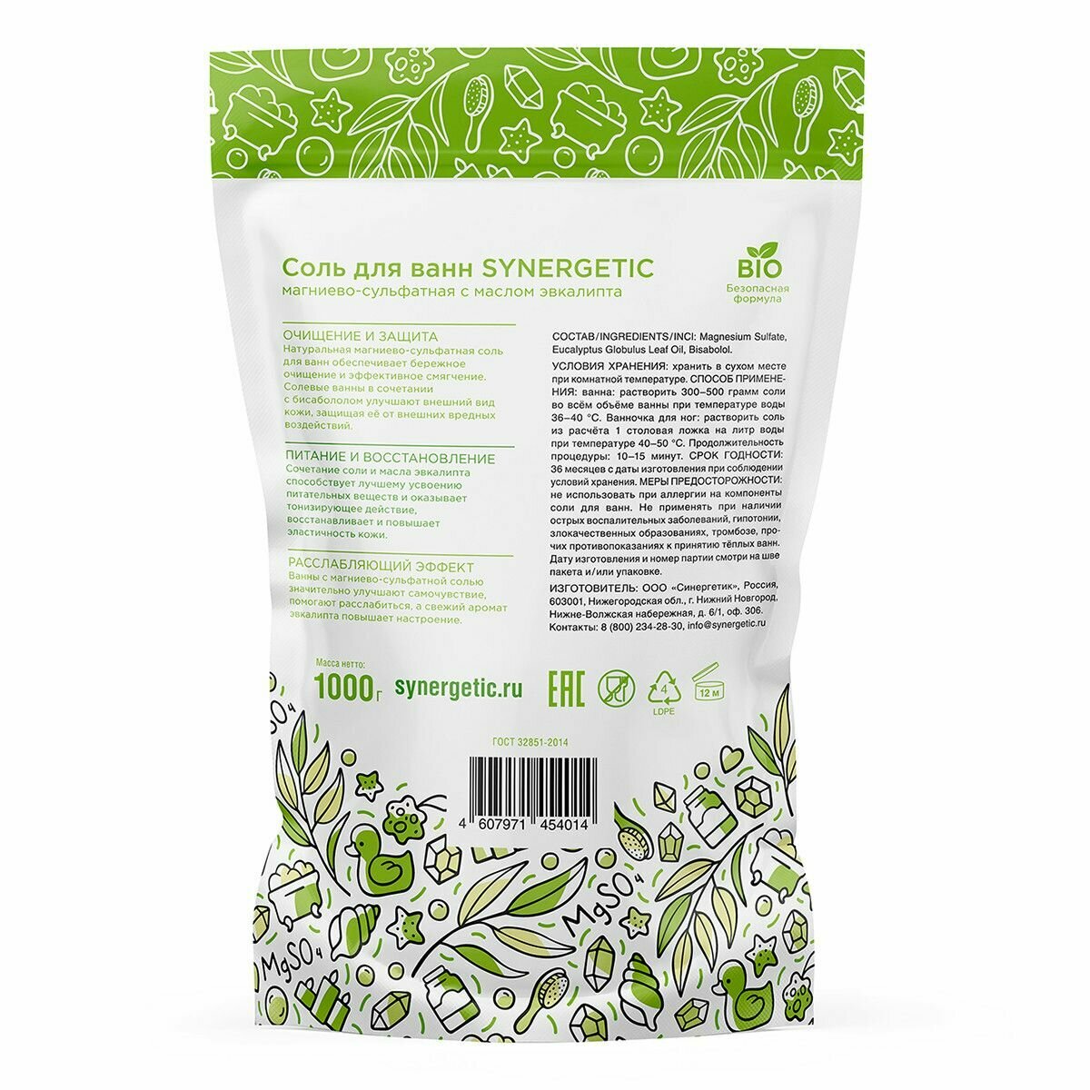 | Дополнительная информация | Соль для ванн SYNERGETIC Магниево-сульфатная Эвкалипт 1000г |