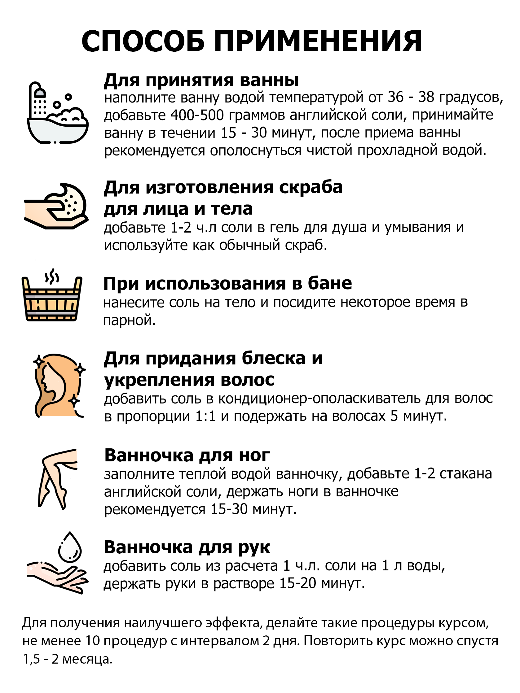 | Способ применения | для принятия ванн: наполните ванну водой температурой от 36 - 38 градусов, добавьте 400-500 граммов английской соли, принимайте ванну в течении 15 - 30 минут, после приема ванны рекомендуется ополоснуться чистой прохладной водой. Для изготовления скраба для лица и тела: добавьте 1-2 ч.л соли в гель для душа и умывания и используйте как обычный скраб. При использовании в бане: нанесите соль на тело и посидите некоторое время в парной. Для придания блеска и укрепления волос: добавить соль в кондиционер-ополаскиватель для волос в пропорции 1:1 и подержать на волосах 5 минут. Ванночка для ног: заполните теплой водой ванночку, добавьте 1-2 стакана английской соли, держать ноги в ванночке рекомендуется 15-30 минут. Ванночка для рук: добавить соль из расчета 1 ч.л. соли на 1 л воды, держать руки в растворе 15-20 минут. Для получения наилучшего эффекта, делайте такие процедуры курсом, не менее 10 процедур с интервалом 2 дня, повторить курс можно спустя 1,5 - 2 месяца. |