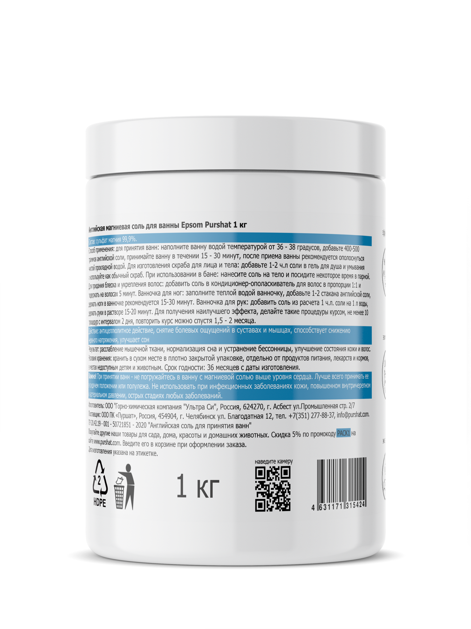 Купить Английская магниевая соль для ванны Epsom Purshat 1 кг
