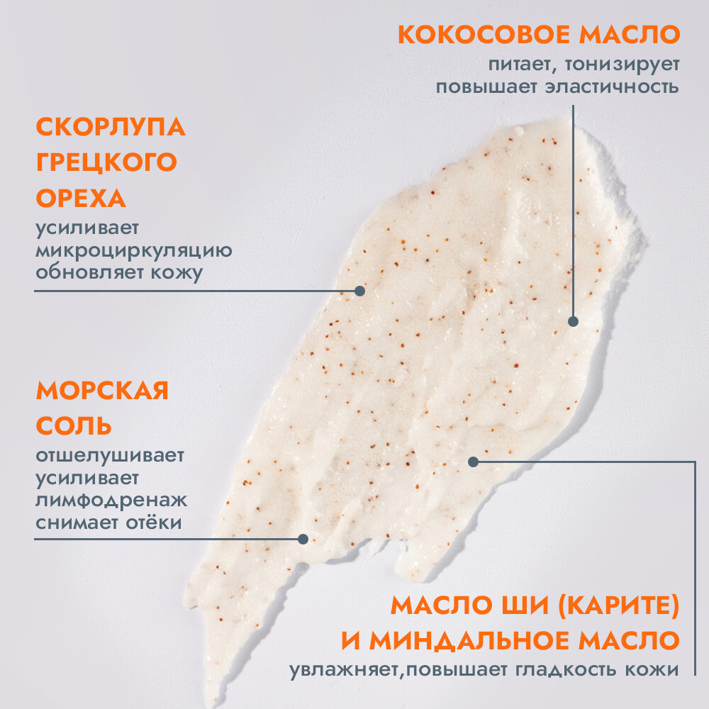 | Способ применения | Нанесите скраб на влажную или сухую кожу круговыми массирующими движениями. Оставьте на 5-10 минут, смойте тёплой водой. Используйте 1-2 раза в неделю. |