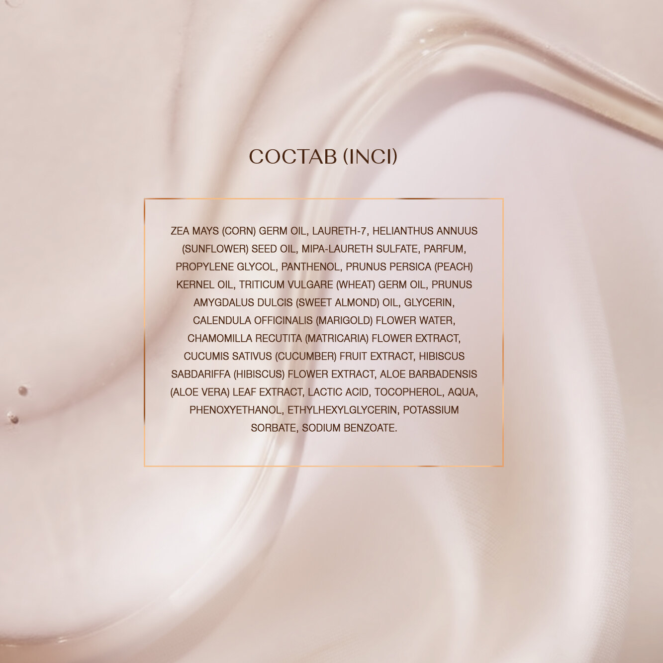 | Состав | Zea Mays (Corn) Germ Oil, Laureth-7, Helianthus Annuus (Sunflower) Seed Oil, Mipa-Laureth Sulfate, Parfum, Propylene Glycol, Panthenol, Prunus Persica (Peach) Kernel Oil, Triticum Vulgare (Wheat) Germ Oil, Prunus Amygdalus Dulcis (Sweet Almond) Oil, Glycerin, Calendula Officinalis (Marigold) Flower Water, Chamomilla Recutita (Matricaria) Flower Extract, Cucumis Sativus (Cucumber) Fruit Extract, Hibiscus Sabdariffa (Hibiscus) Flower Extract, Aloe Barbadensis (Aloe Vera) Leaf Extract, Lactic Acid, Tocopherol, Aqua, Phenoxyethanol, Ethylhexylglycerin, Potassium Sorbate, Sodium Benzoate |